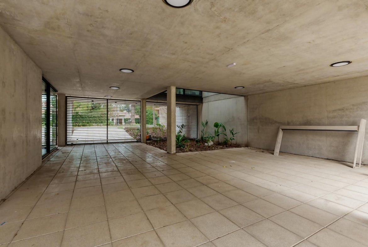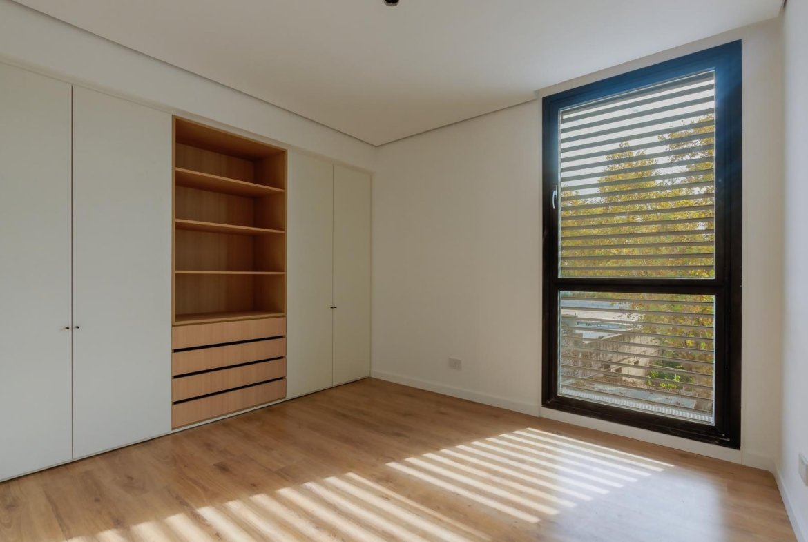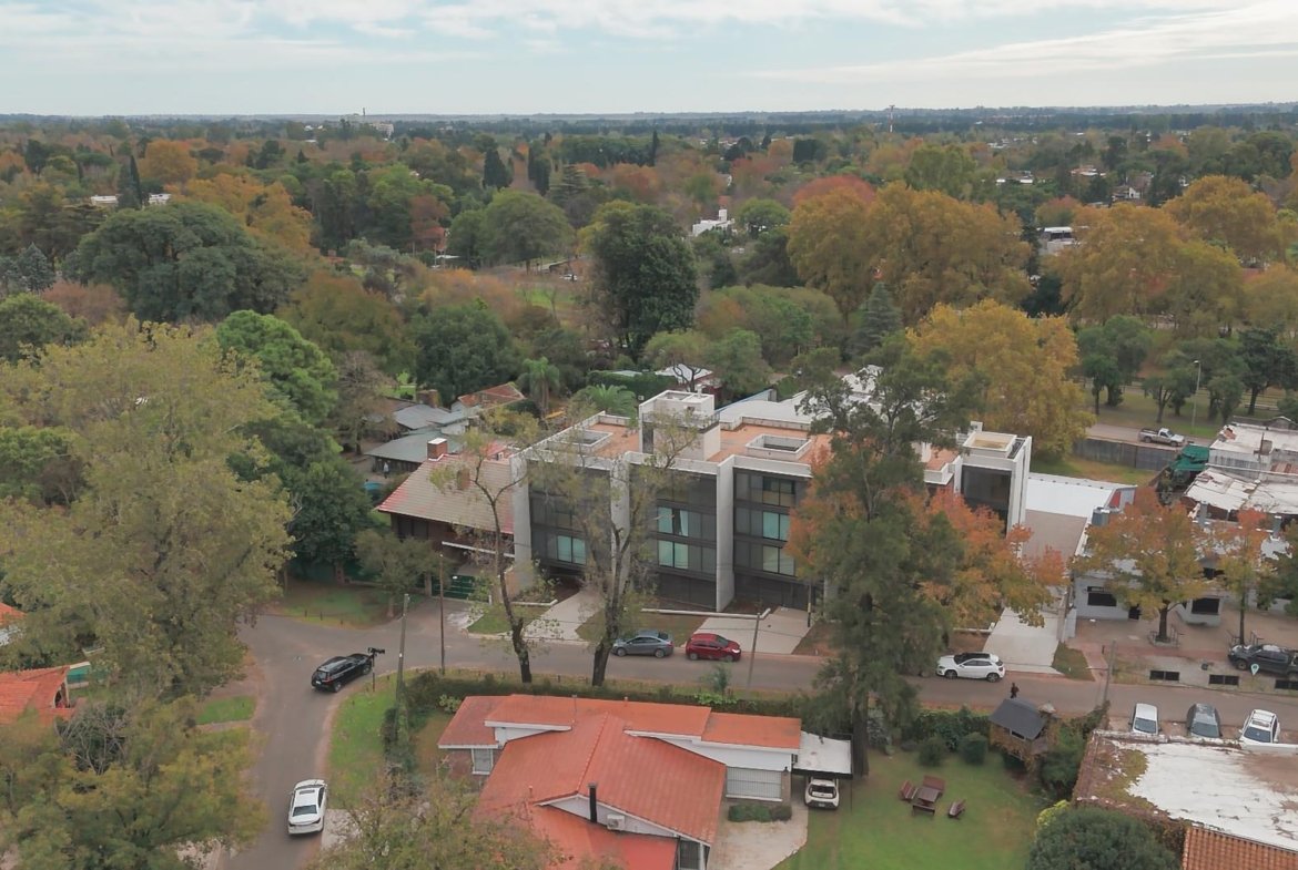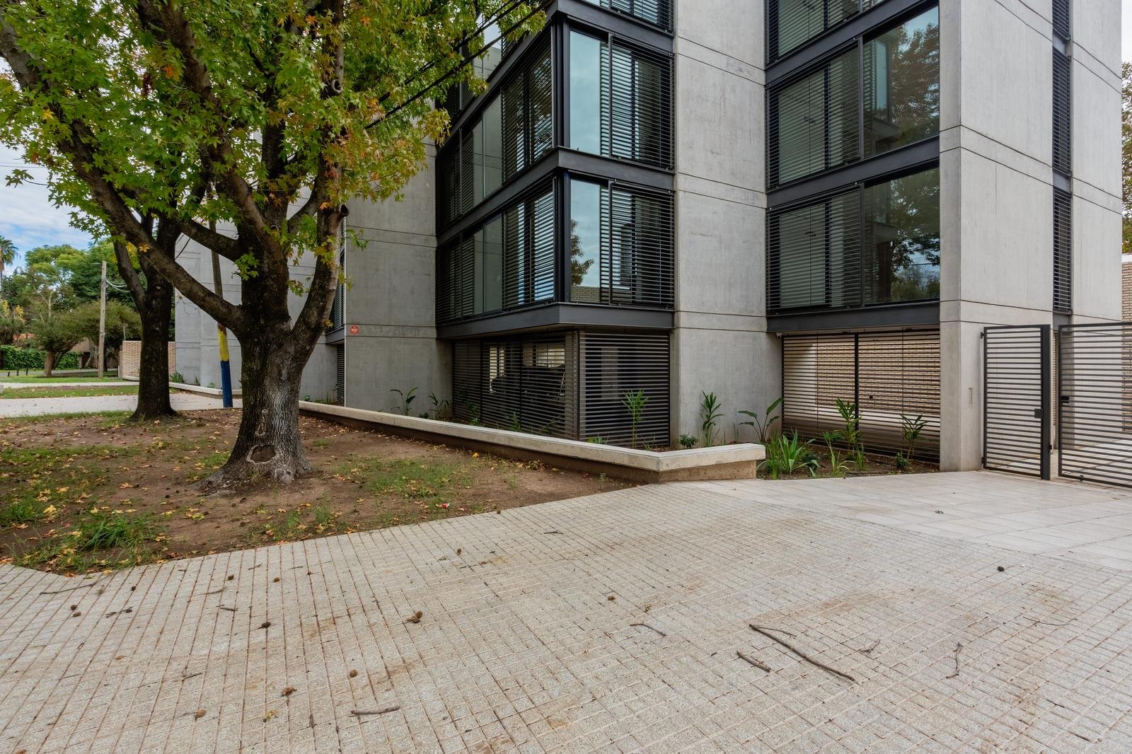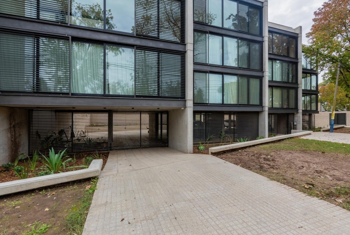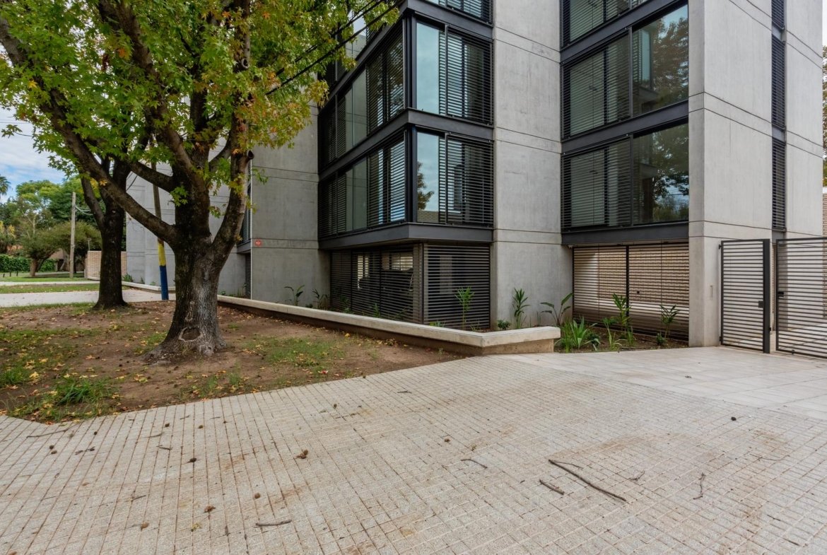 El edificio se compone por dos cuerpos de 3 plantas con unidades en semipiso de dos y tres dormitorios, y con superficies exclusivas de 94 m2 y 112 m2 respectivamente.En la planta baja, y a partir de un ingreso general al edificio, se accede a cada uno de los halles de ingreso para cada bloque de departamentos, ubicándose también en esta misma planta las cocheras cubiertas y exclusivas para cada unidad. En su azotea se desarrolla una amplia terraza recreativa, la cual se encontrará inmersa en la añosa arboleda que la encierra, y contará con piscina, solarium, espacio con fogonero y áreas de servicios. El original y particular diseño genera el constante ingreso de luz natural a las unidades mediante un vacío o patio central, a la vez que la fachada vidriada permite incorporar el exterior en la vida interior de las unidades.La materialidad exterior del edificio se caracteriza por el uso de hormigón visto, perfilería de acero y ladrillo visto color arena. Cuenta además con generosas superficies acristaladas, y celosías corredizas para protección visual y solar en caso de necesitarse.En las unidades hay instaladas aberturas Aluar A40, pisos flotantes vinílicos símil madera de primera calidad, cielorrasos suspendidos de placas de yeso, mesadas de silestone, amoblamientos y revestimientos interiores melamínicos. Tanto la calefacción como la refrigeración se resuelven con la preinstalación para sistemas multisplit inverter el cual ya esta instalado, sistema que se caracteriza por su alta eficiencia energética y a su vez permite que cada unidad exterior sea ubicada de manera oculta en la azotea del emprendimiento. El departamento esta equipado con cortinas de primera calidad, campana.