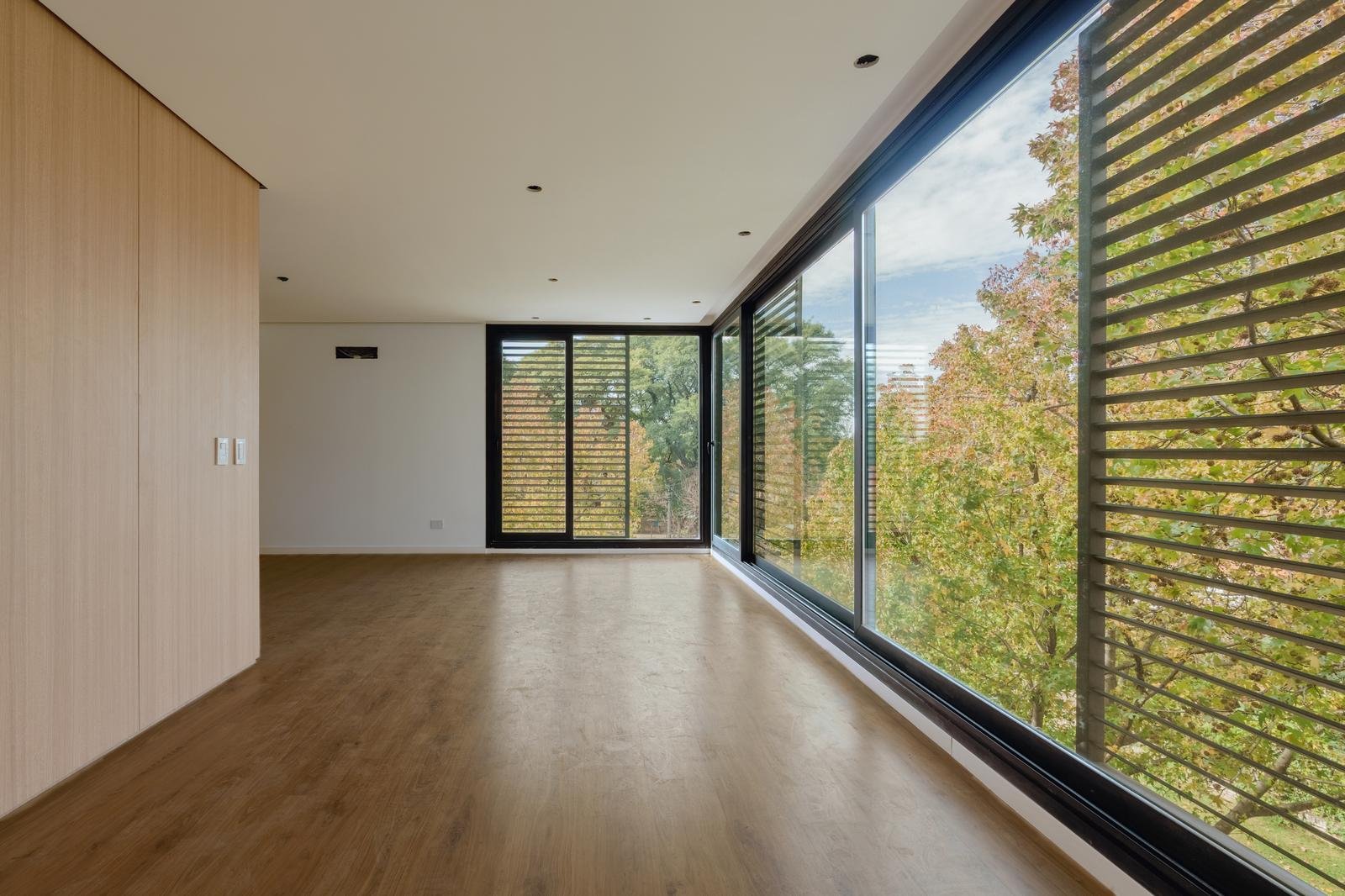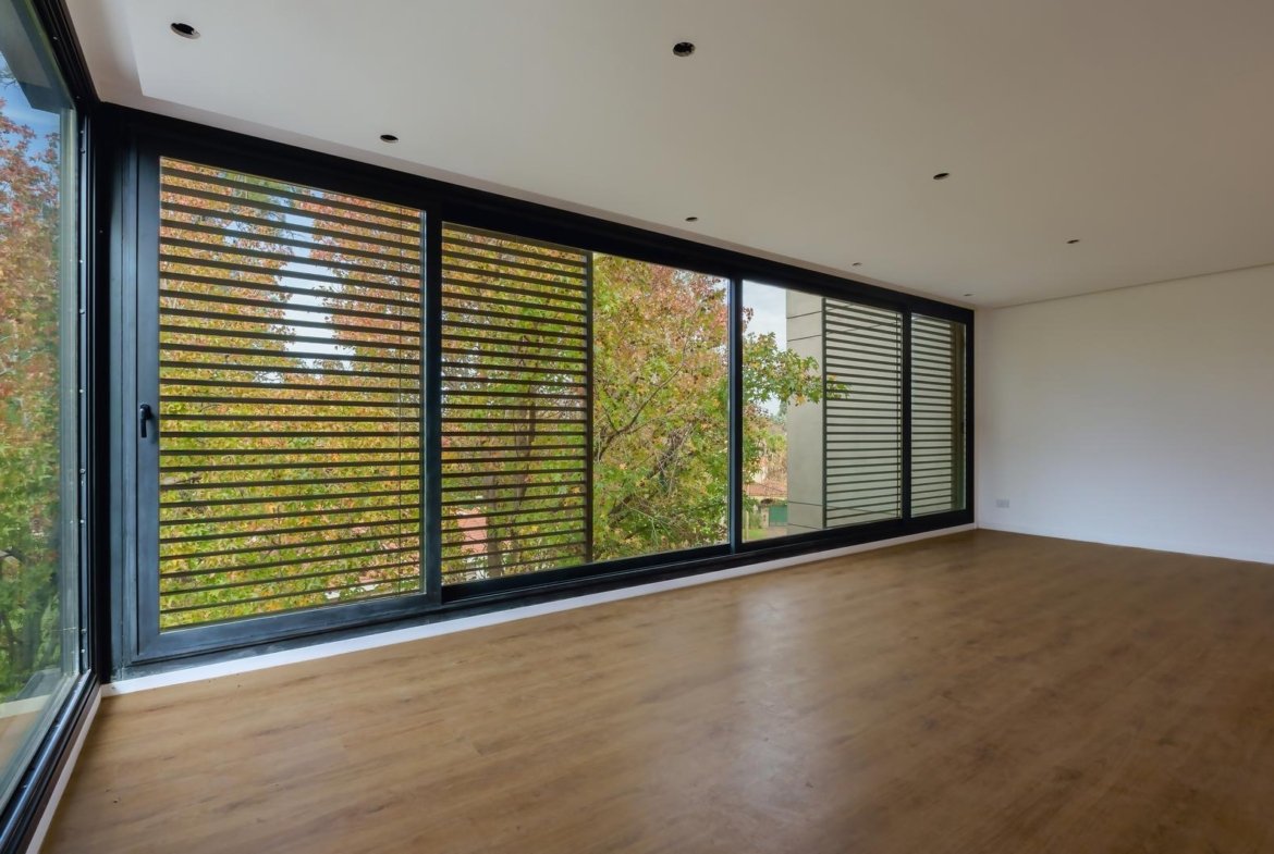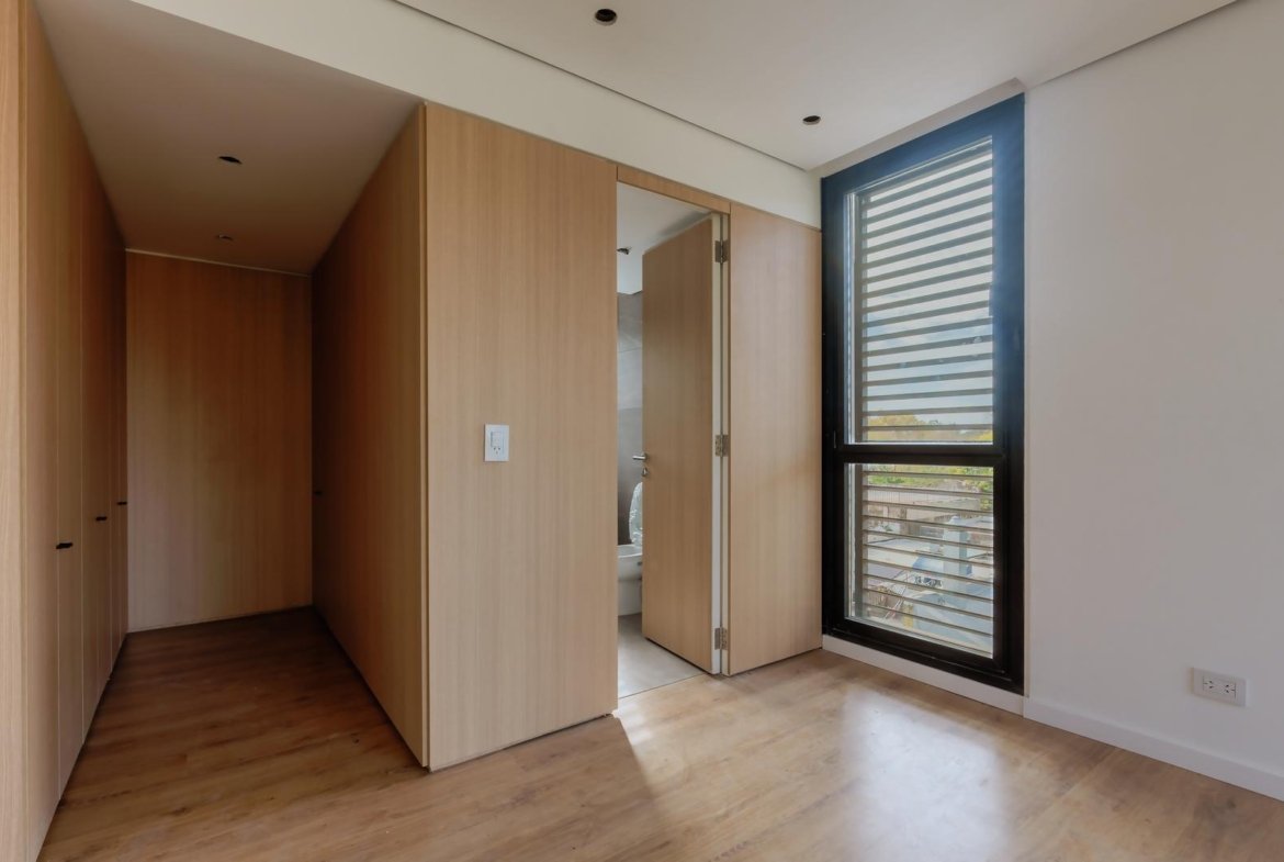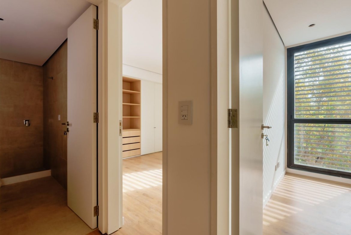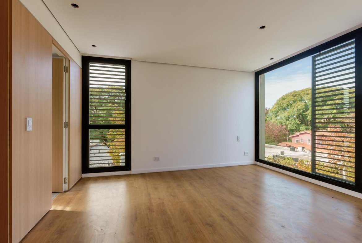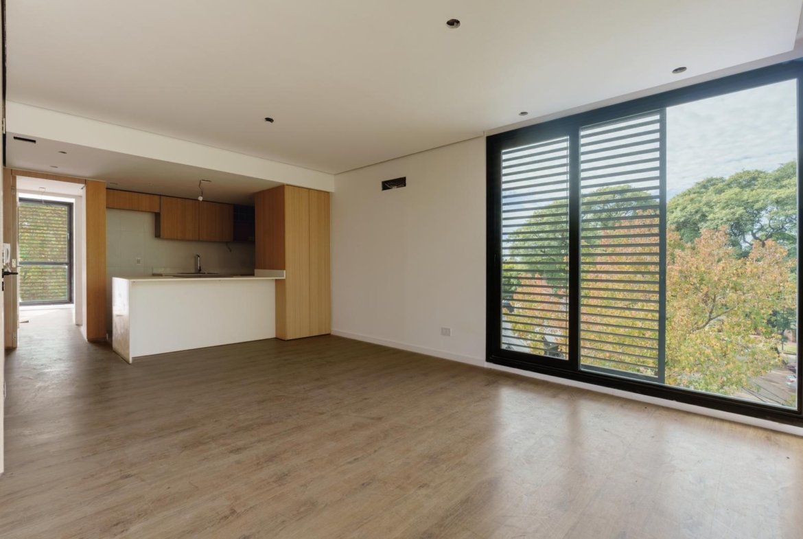 El edificio se compone por dos cuerpos de 3 plantas con unidades en semipiso de dos y tres dormitorios, y con superficies exclusivas de 94 m2 y 112 m2 respectivamente.En la planta baja, y a partir de un ingreso general al edificio, se accede a cada uno de los halles de ingreso para cada bloque de departamentos, ubicándose también en esta misma planta las cocheras cubiertas y exclusivas para cada unidad. En su azotea se desarrolla una amplia terraza recreativa, la cual se encontrará inmersa en la añosa arboleda que la encierra, y contará con piscina, solarium, espacio con fogonero y áreas de servicios. El original y particular diseño genera el constante ingreso de luz natural a las unidades mediante un vacío o patio central, a la vez que la fachada vidriada permite incorporar el exterior en la vida interior de las unidades.La materialidad exterior del edificio se caracteriza por el uso de hormigón visto, perfilería de acero y ladrillo visto color arena. Cuenta además con generosas superficies acristaladas, y celosías corredizas para protección visual y solar en caso de necesitarse.En las unidades hay instaladas aberturas Aluar A40, pisos flotantes vinílicos símil madera de primera calidad, cielorrasos suspendidos de placas de yeso, mesadas de silestone, amoblamientos y revestimientos interiores melamínicos. Tanto la calefacción como la refrigeración se resuelven con la preinstalación para sistemas multisplit inverter el cual ya esta instalado, sistema que se caracteriza por su alta eficiencia energética y a su vez permite que cada unidad exterior sea ubicada de manera oculta en la azotea del emprendimiento. El departamento esta equipado con cortinas de primera calidad, campana.
