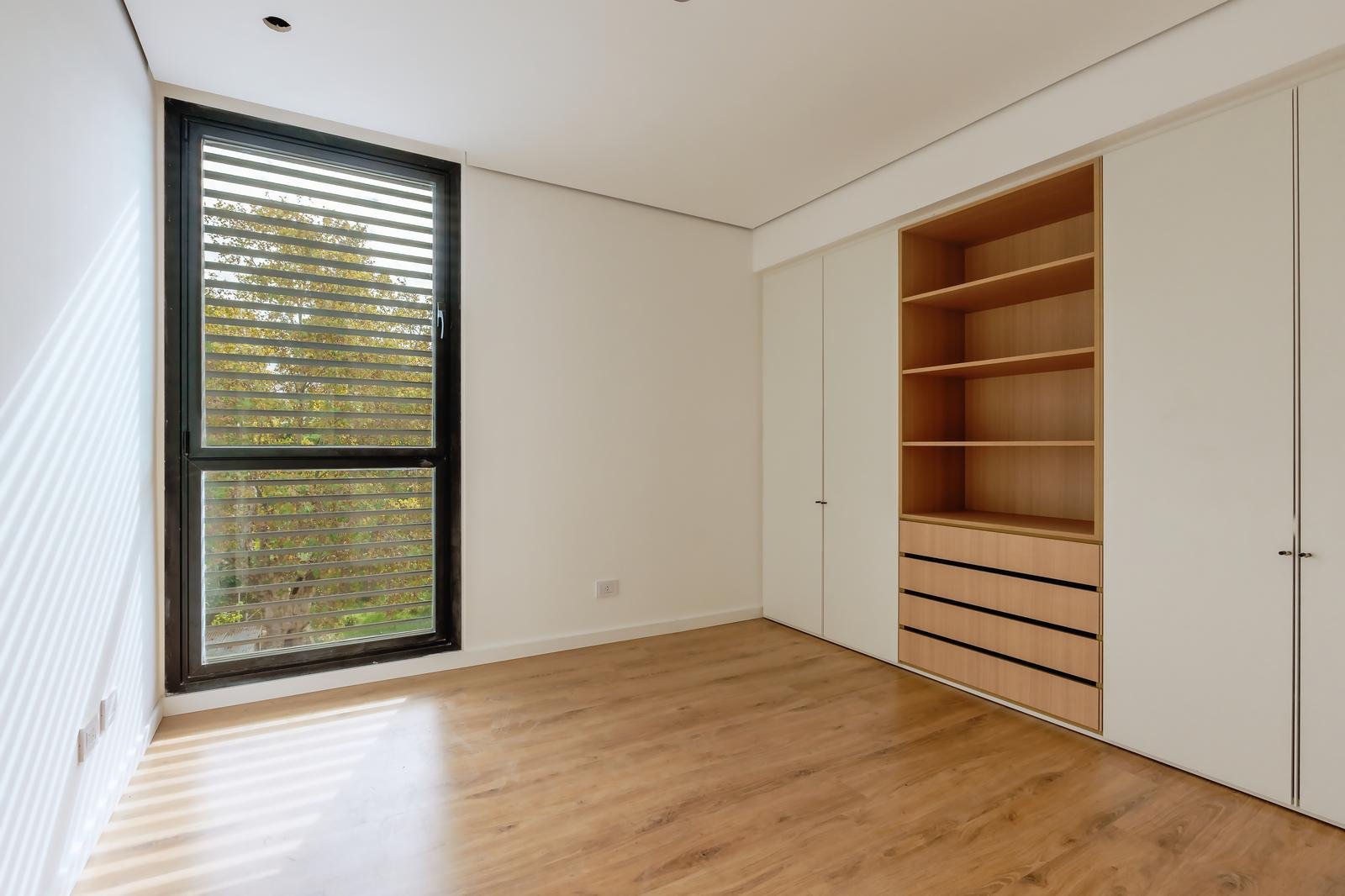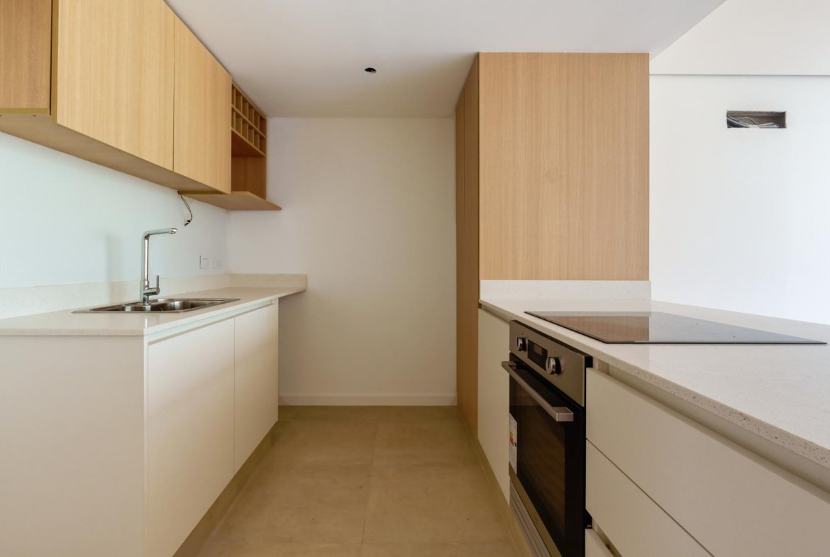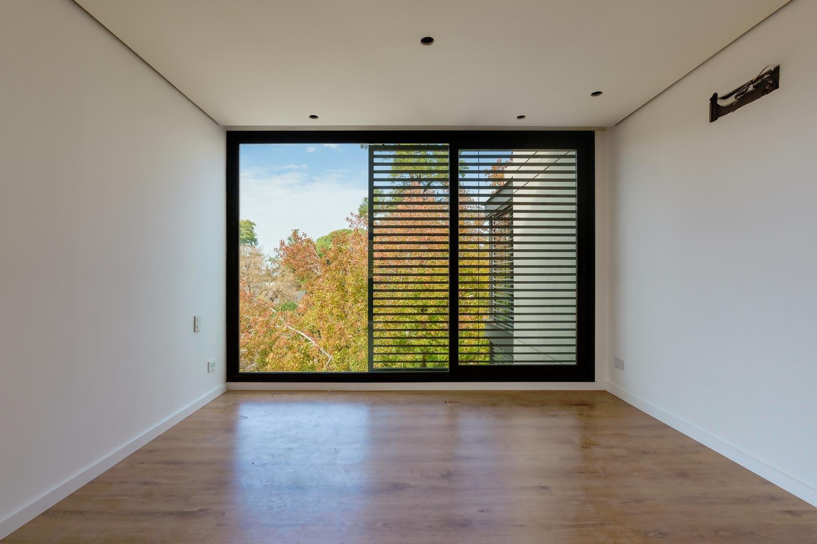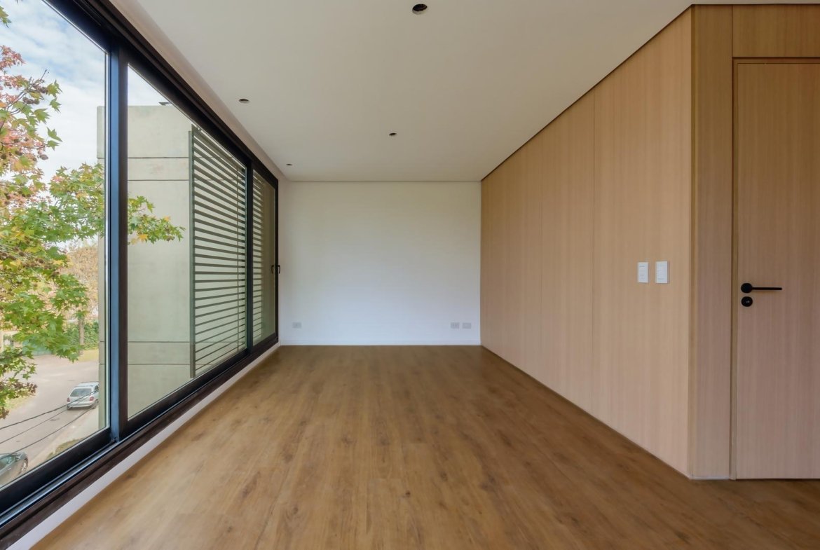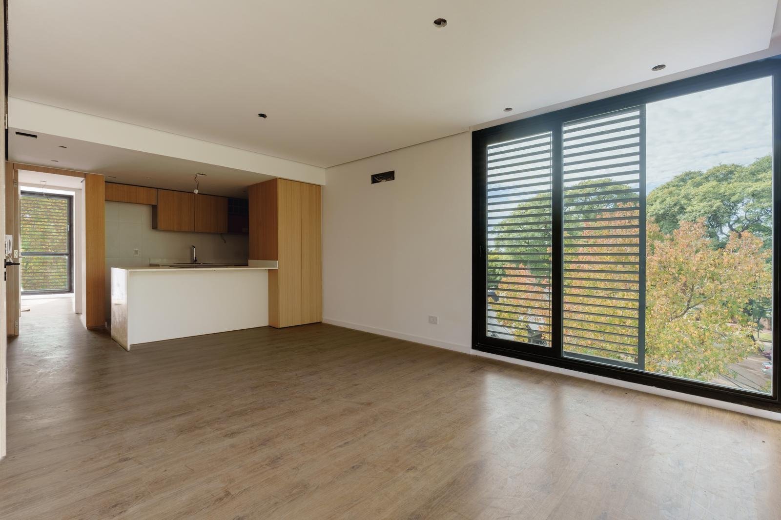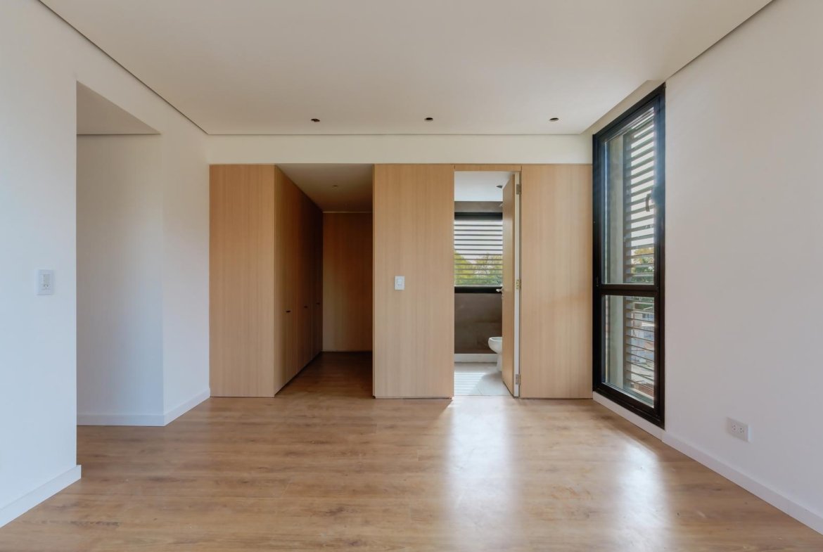 El edificio se compone por dos cuerpos de 3 plantas con unidades en semipiso de dos y tres dormitorios, y con superficies exclusivas de 94 m2 y 112 m2 respectivamente.En la planta baja, y a partir de un ingreso general al edificio, se accede a cada uno de los halles de ingreso para cada bloque de departamentos, ubicándose también en esta misma planta las cocheras cubiertas y exclusivas para cada unidad. En su azotea se desarrolla una amplia terraza recreativa, la cual se encontrará inmersa en la añosa arboleda que la encierra, y contará con piscina, solarium, espacio con fogonero y áreas de servicios. El original y particular diseño genera el constante ingreso de luz natural a las unidades mediante un vacío o patio central, a la vez que la fachada vidriada permite incorporar el exterior en la vida interior de las unidades.La materialidad exterior del edificio se caracteriza por el uso de hormigón visto, perfilería de acero y ladrillo visto color arena. Cuenta además con generosas superficies acristaladas, y celosías corredizas para protección visual y solar en caso de necesitarse.En las unidades hay instaladas aberturas Aluar A40, pisos flotantes vinílicos símil madera de primera calidad, cielorrasos suspendidos de placas de yeso, mesadas de silestone, amoblamientos y revestimientos interiores melamínicos. Tanto la calefacción como la refrigeración se resuelven con la preinstalación para sistemas multisplit inverter el cual ya esta instalado, sistema que se caracteriza por su alta eficiencia energética y a su vez permite que cada unidad exterior sea ubicada de manera oculta en la azotea del emprendimiento. El departamento esta equipado con cortinas de primera calidad, campana.