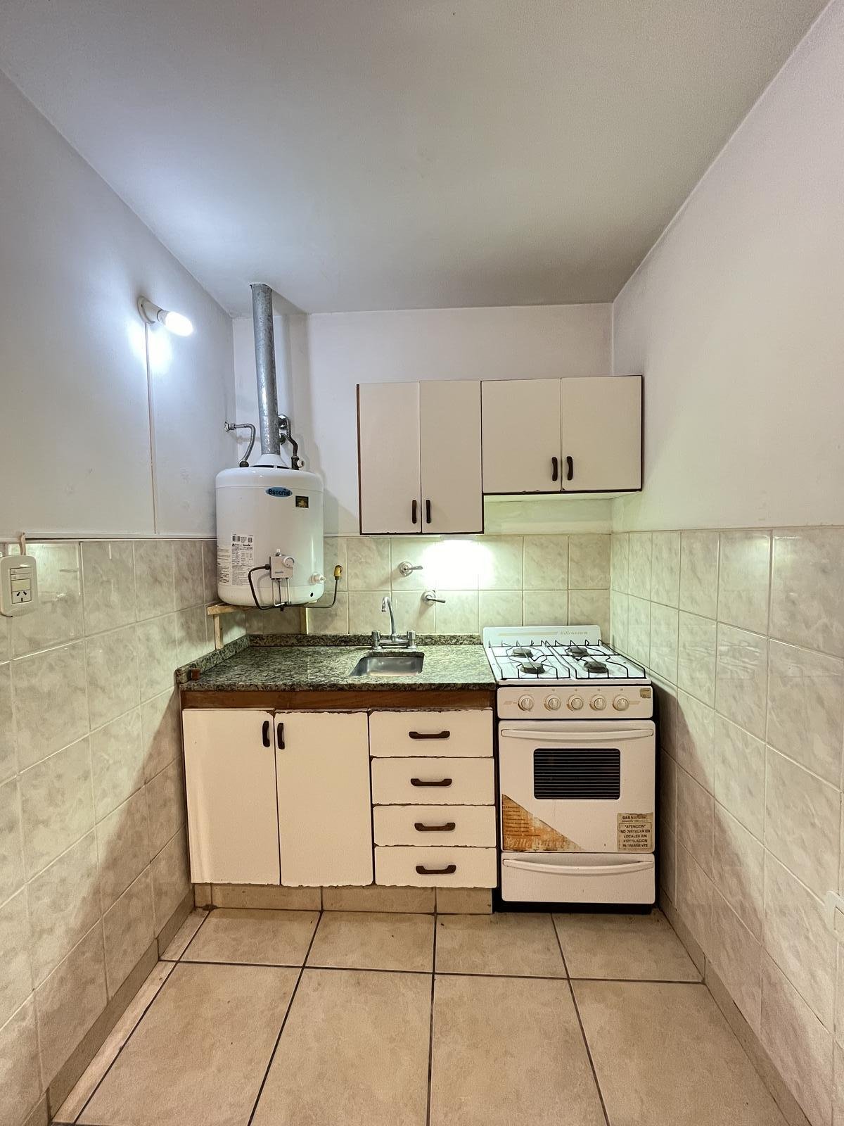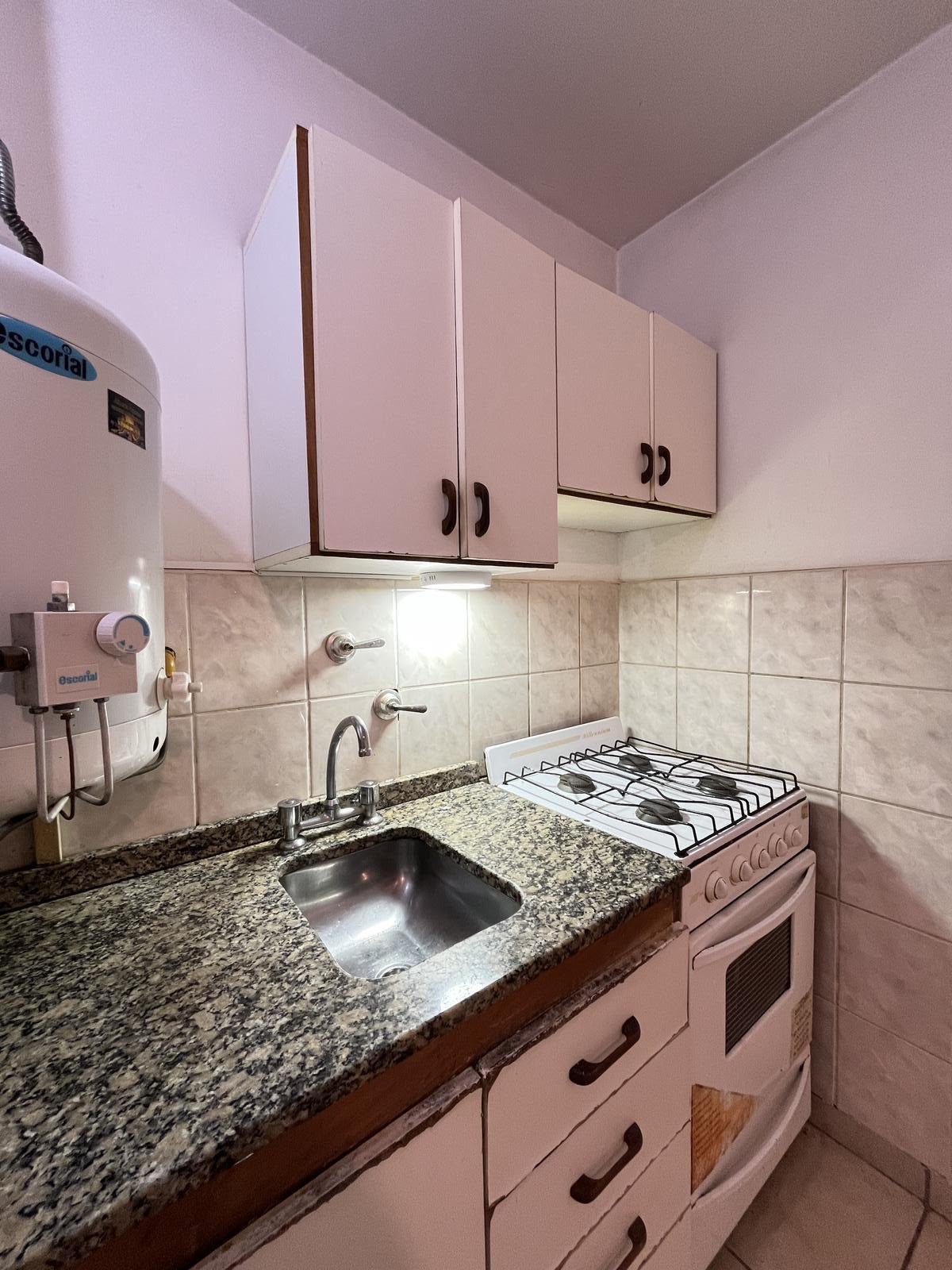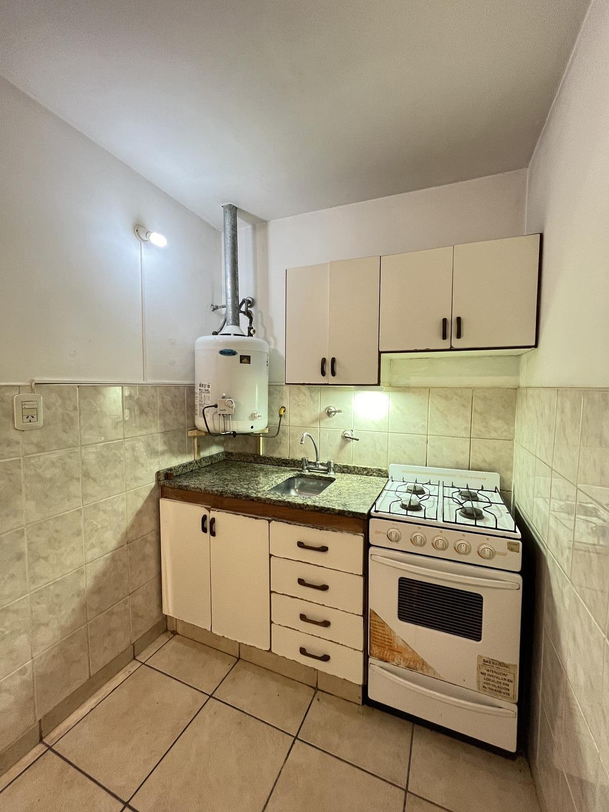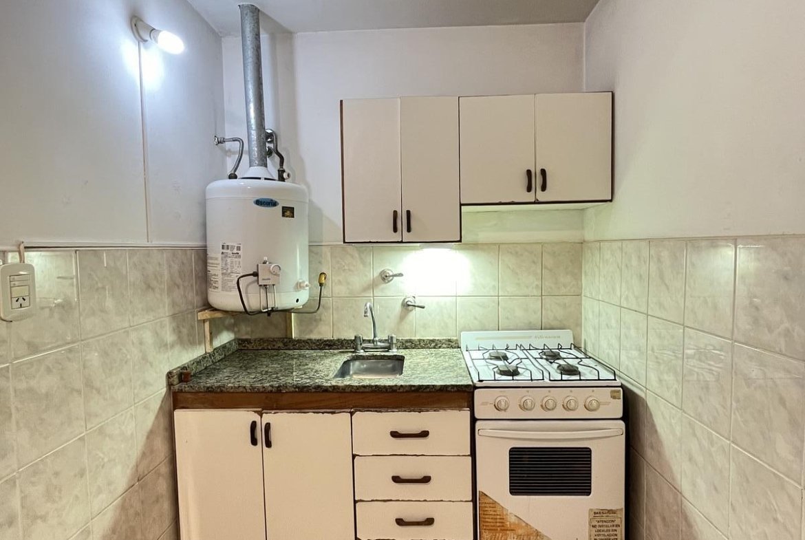La unidad cuenta con acceso por puerta de madera a un luminoso living comedor, con cocina integrada equipada con bajo mesada y alacena, ideal para optimizar el espacio.