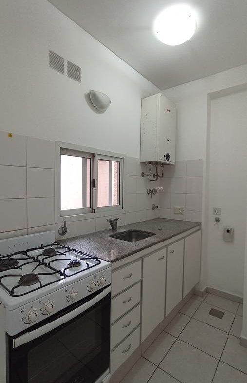 La cocina es integrada y cuenta con ventilación natural, amoblamiento de bajo mesada, espacio técnico para heladera y artefacto de cocina, mesada de granito, bacha de acero inoxidable y grifería monocomando.