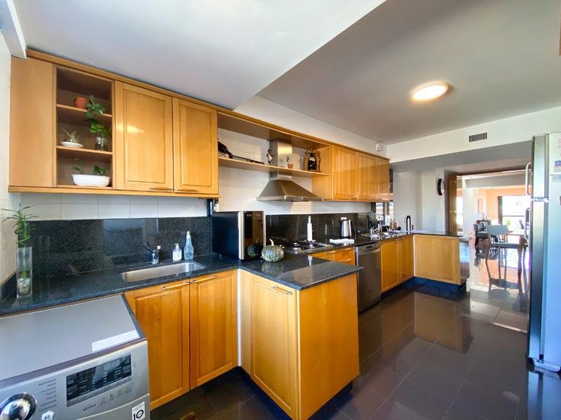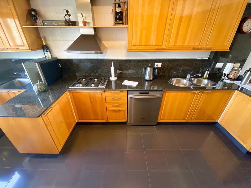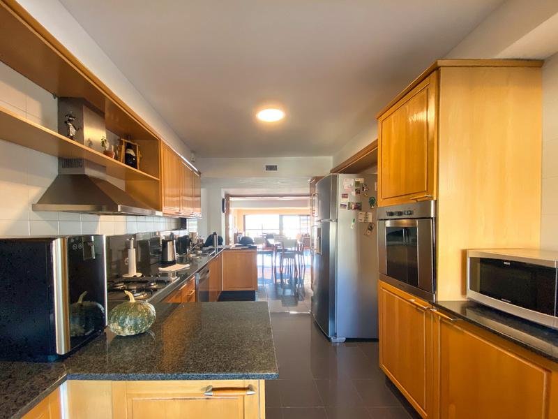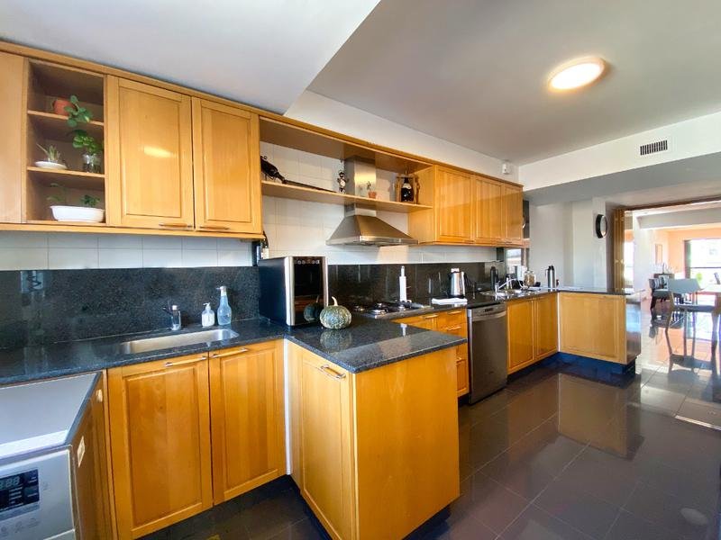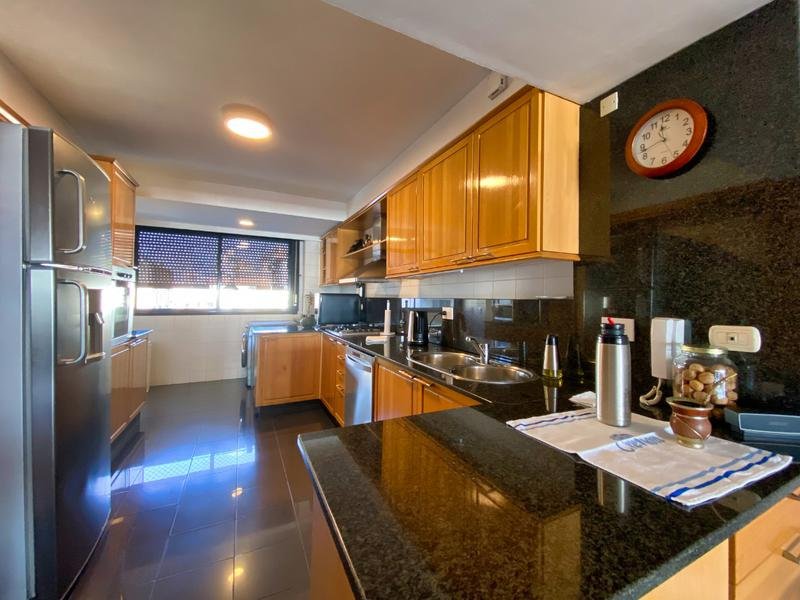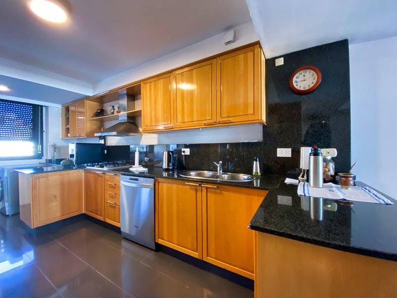 La cocina está equipada con mobiliario premium en madera de haya, mesada de mármol negro y griferías de alta tecnología, junto con artefactos de primera calidad.