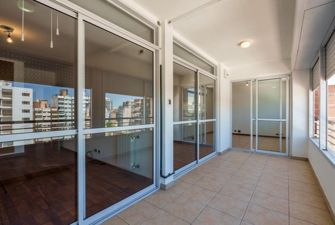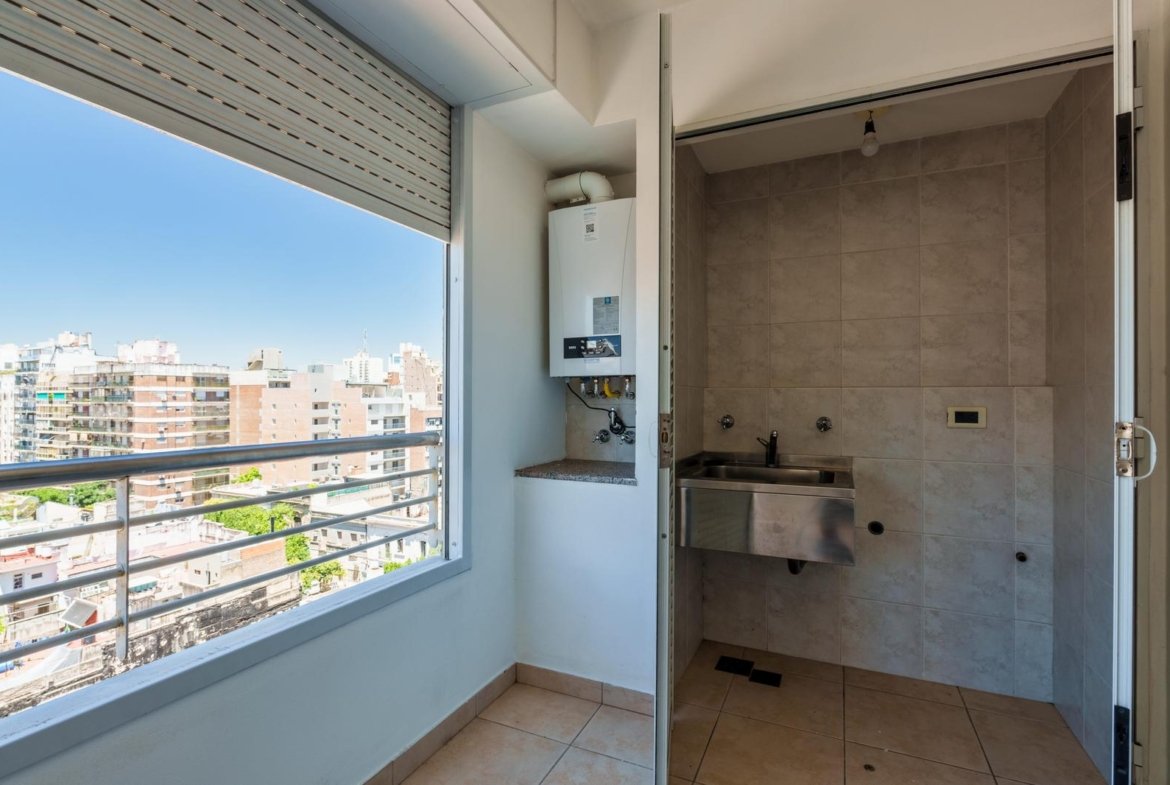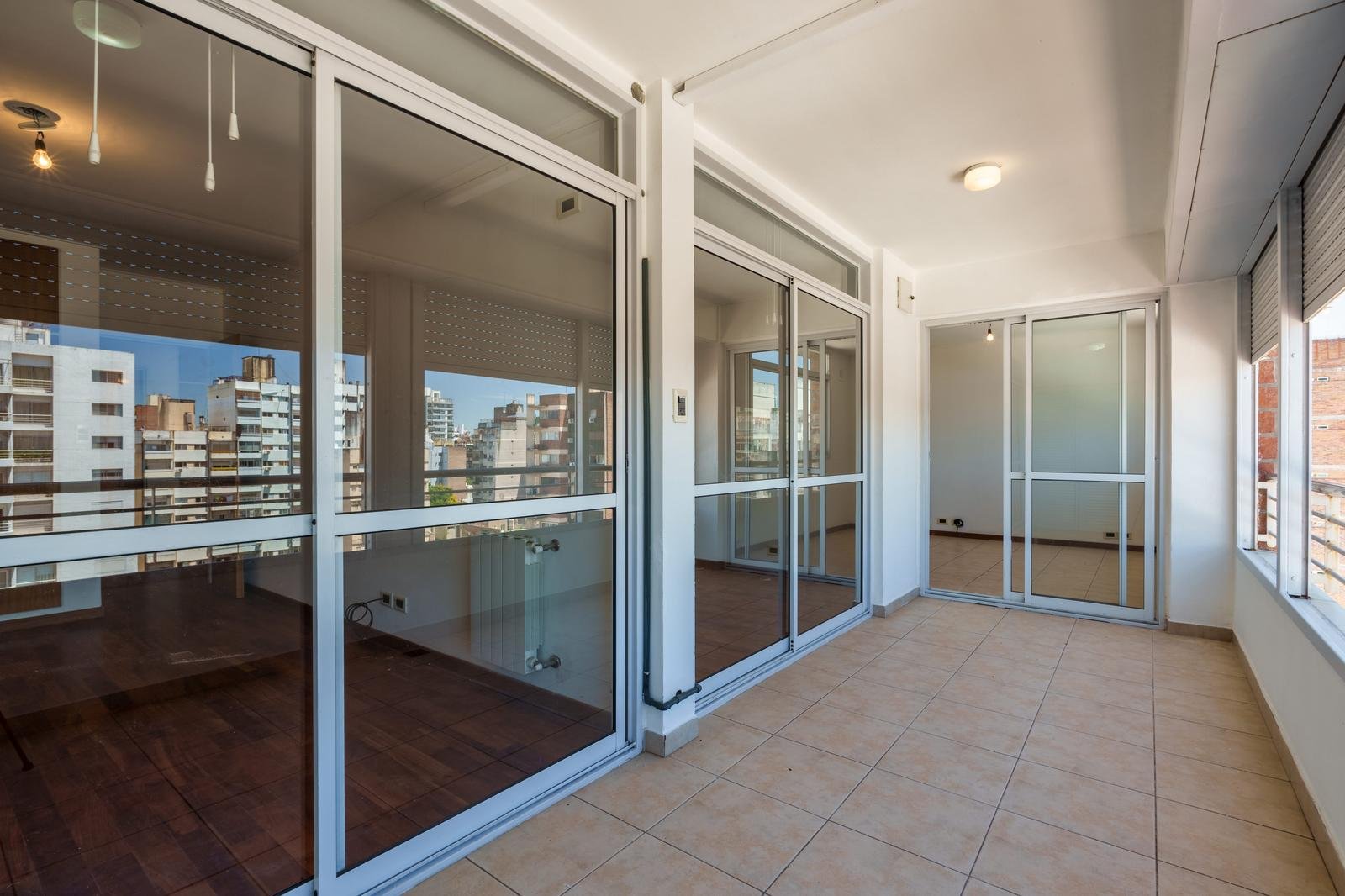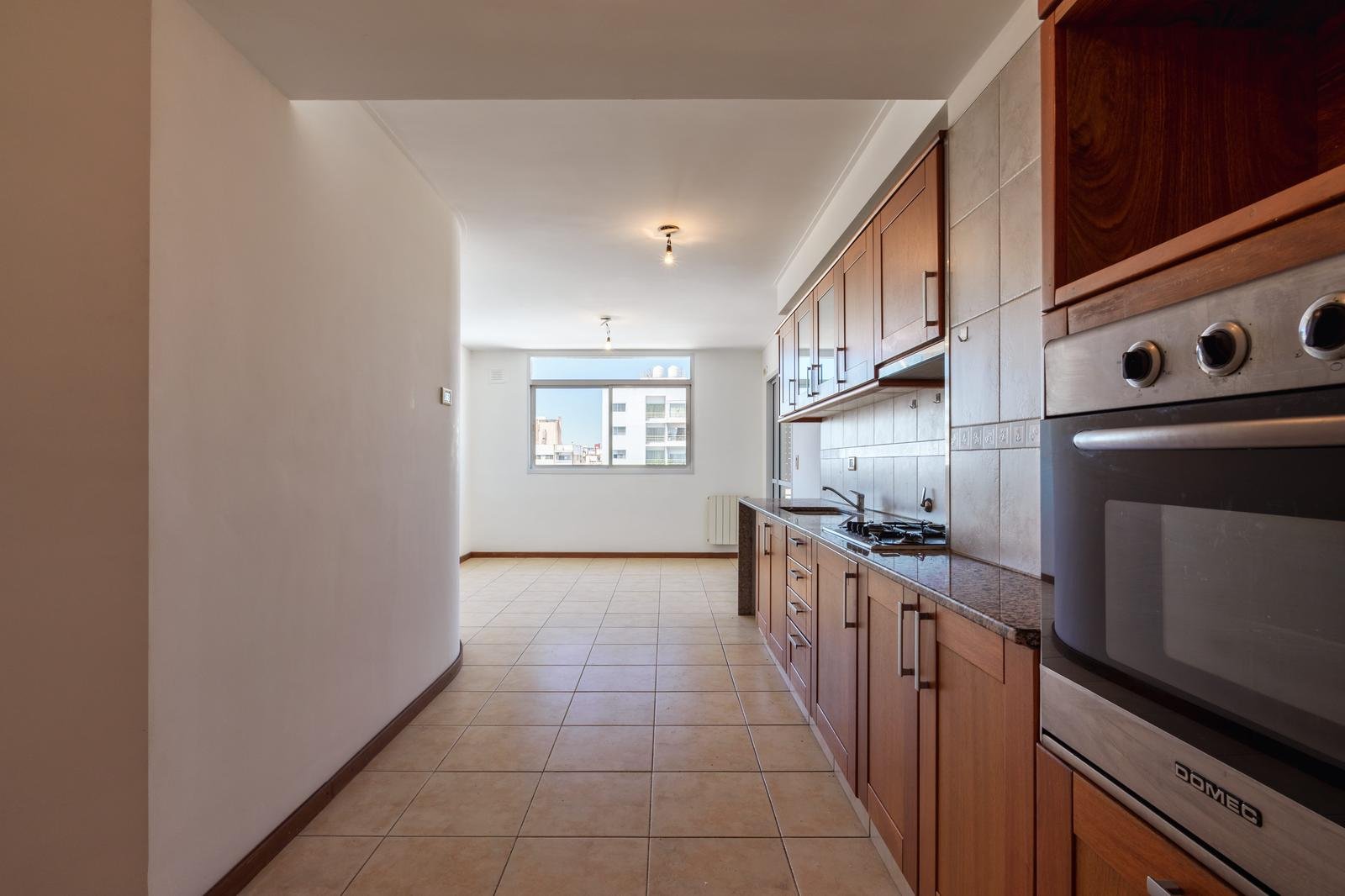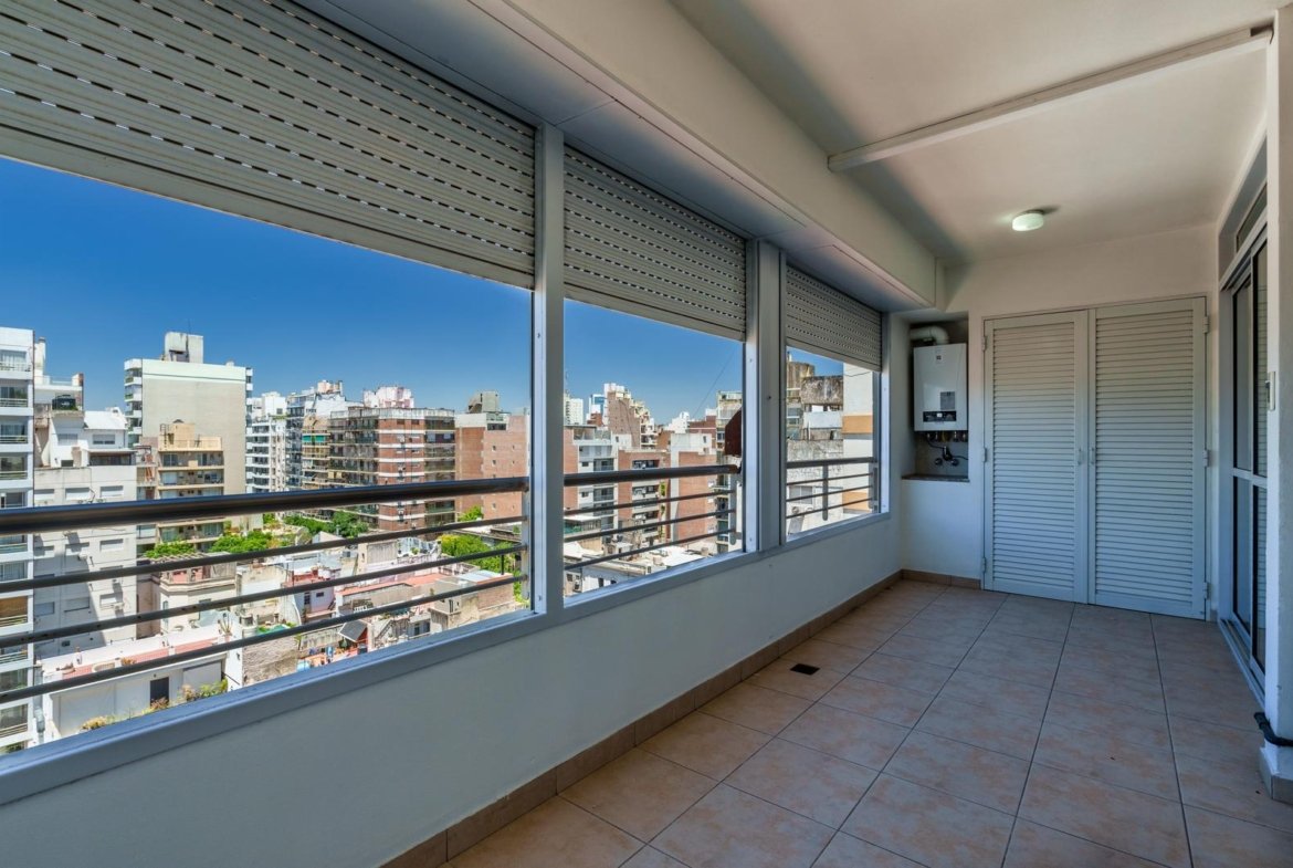 El departamento tiene un diseño funcional con doble ingreso. El principal conduce a un amplio living comedor con grandes ventanales que dan salida a un balcón corrido al frente, completamente cerrado por persianas. El segundo ingreso, directo a la cocina comedor, tiene ventilación natural y un práctico escritorio pasante con un mueble de guardado.
