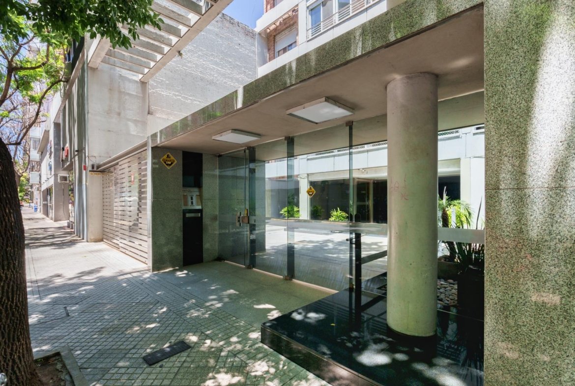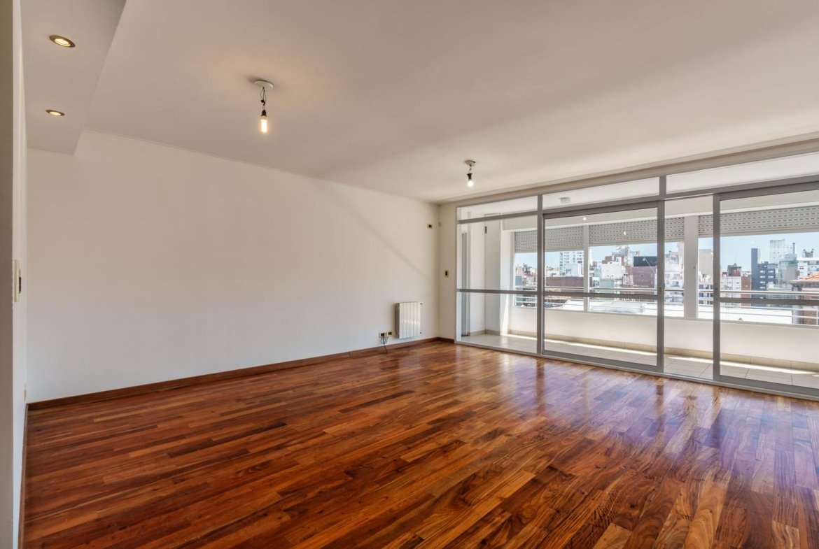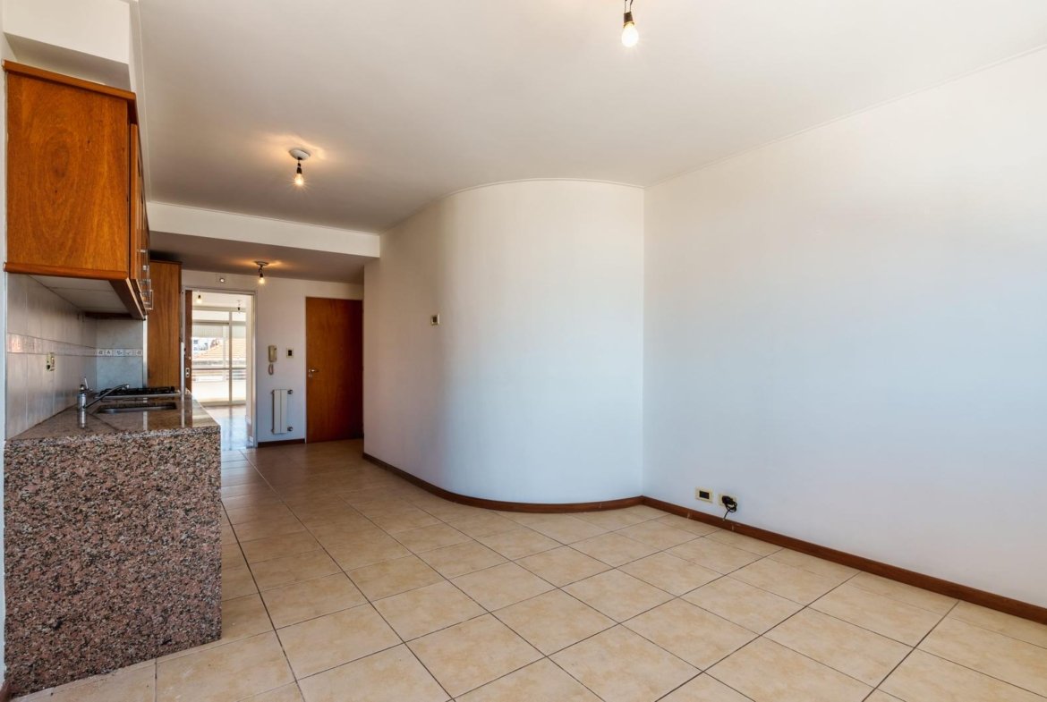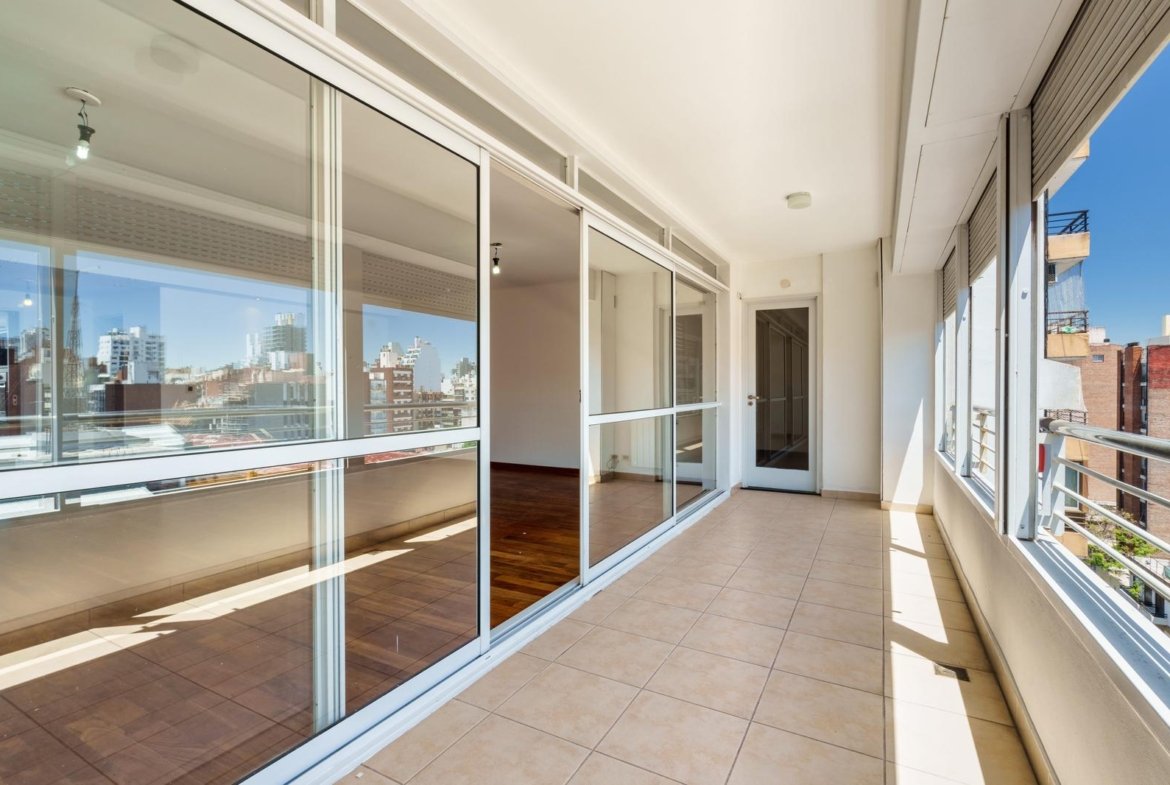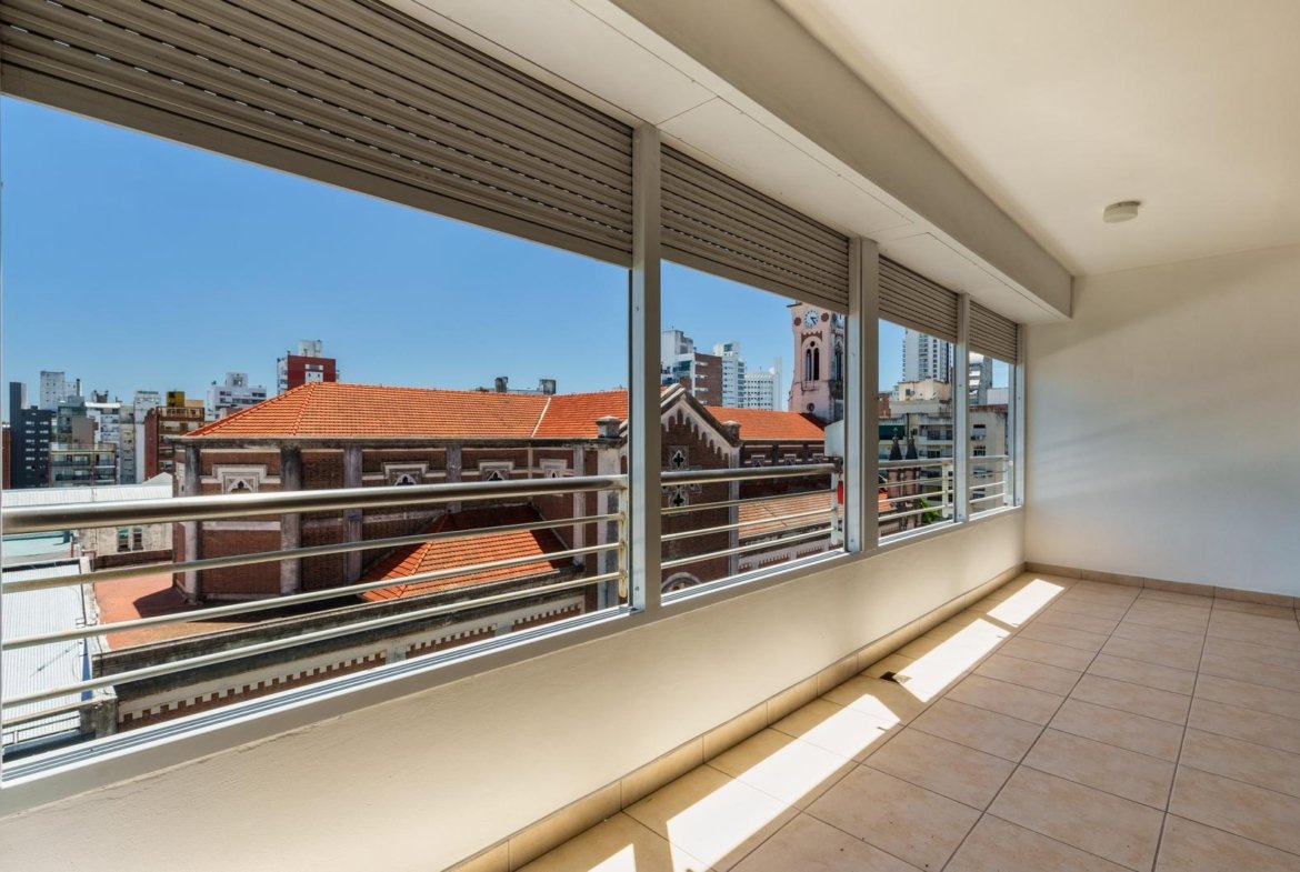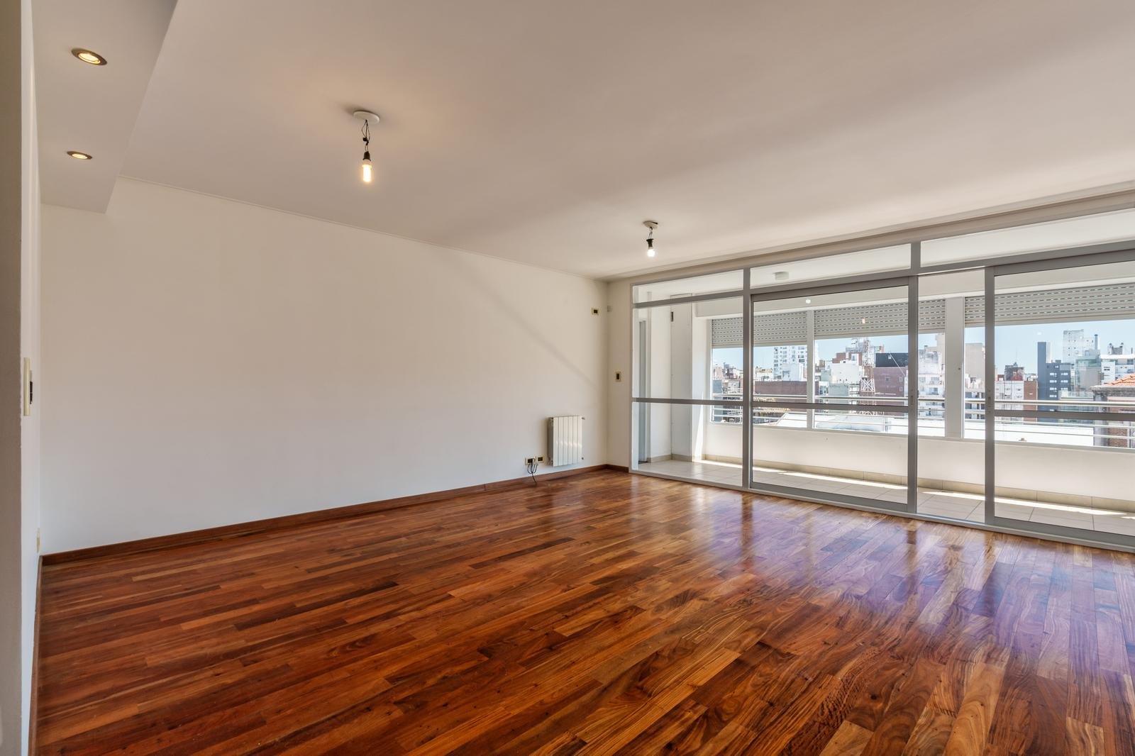El departamento tiene un diseño funcional con doble ingreso. El principal conduce a un amplio living comedor con grandes ventanales que dan salida a un balcón corrido al frente, completamente cerrado por persianas. El segundo ingreso, directo a la cocina comedor, tiene ventilación natural y un práctico escritorio pasante con un mueble de guardado.