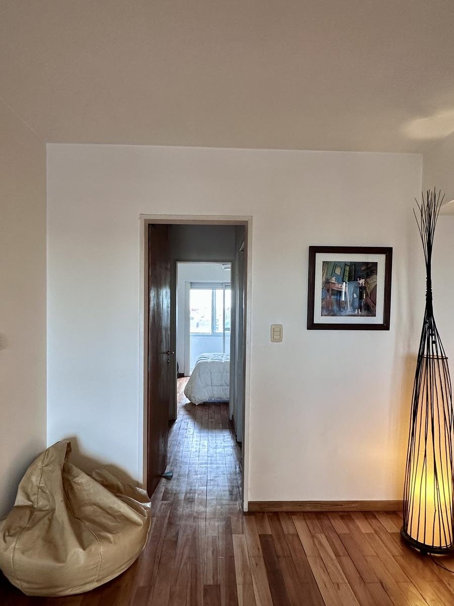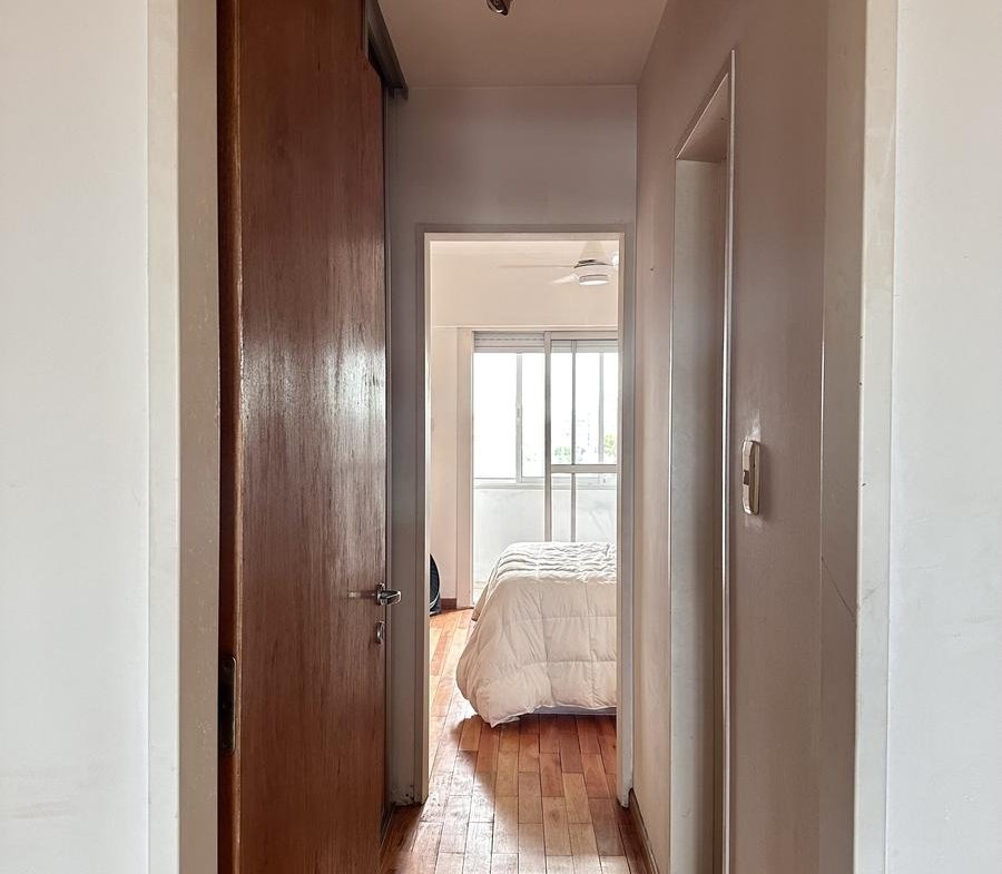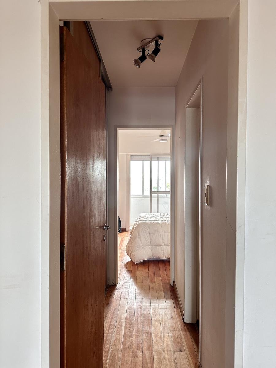 El dormitorio cuenta con salida a un segundo balcón al contrafrente, con cerramiento, perfecto como espacio extra de lectura o trabajo.Baño completo con ventilación natural.Pisos de listones de madera en todo el departamento.