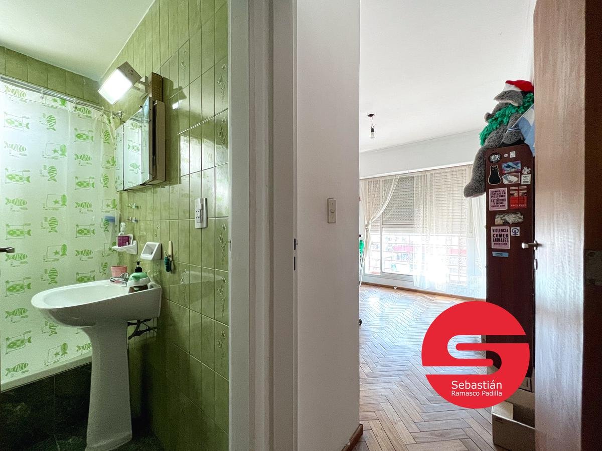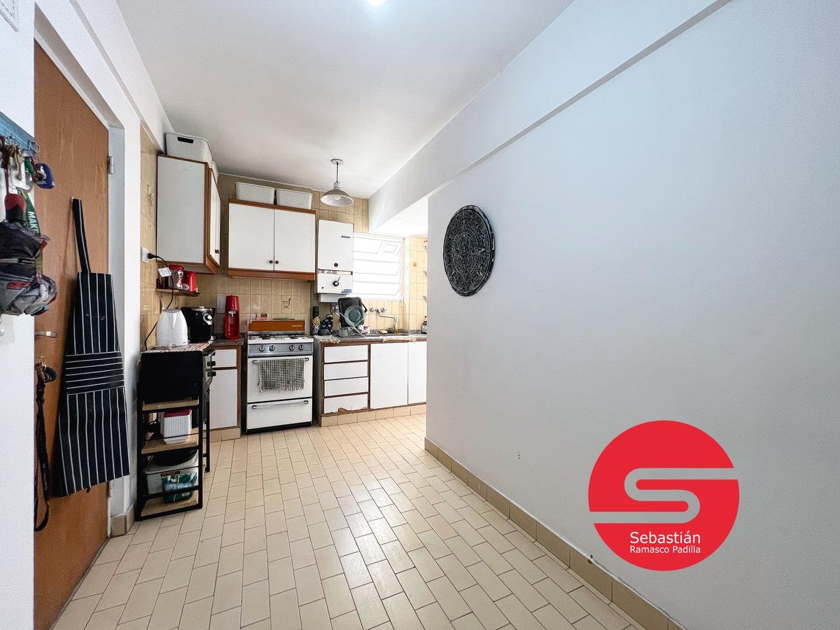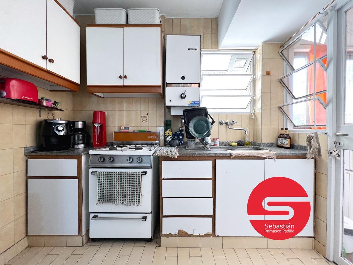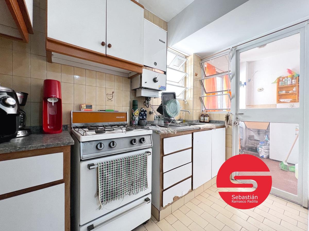 Cocina separada con ventilación natural y salida al lavadero, mesada de granito, bacha doble de acero inoxidable, alacena y bajo mesada de melamina, espacio técnico para cocina y heladera. Lavadero separado con bacha y espacio técnico para lavarropas. Baño completo con bañera, loza sanitaria y grifería en óptimo estado. Dos dormitorios, uno al frente con placard completo y salida al balcón. El segundo dormitorio contrafrente también con placar completo empotrado.