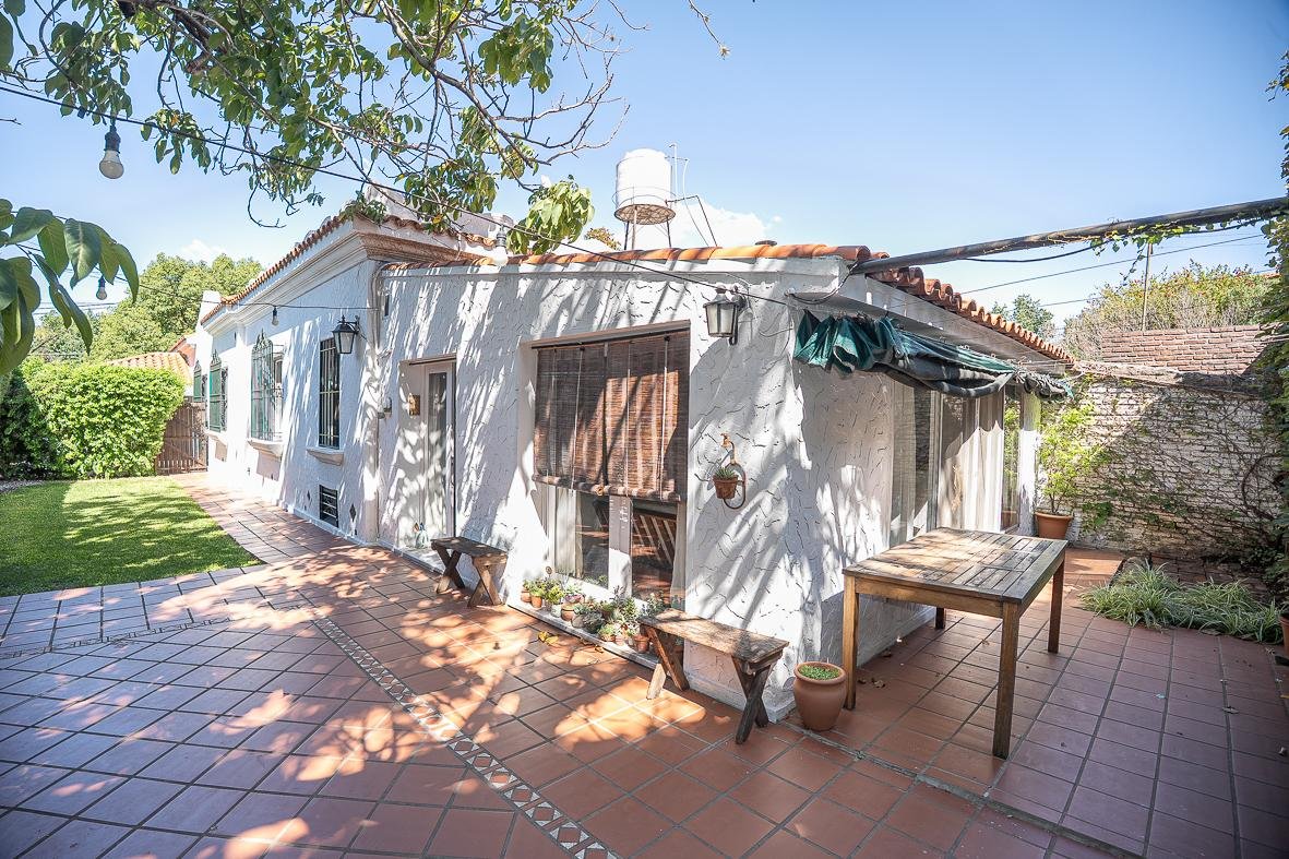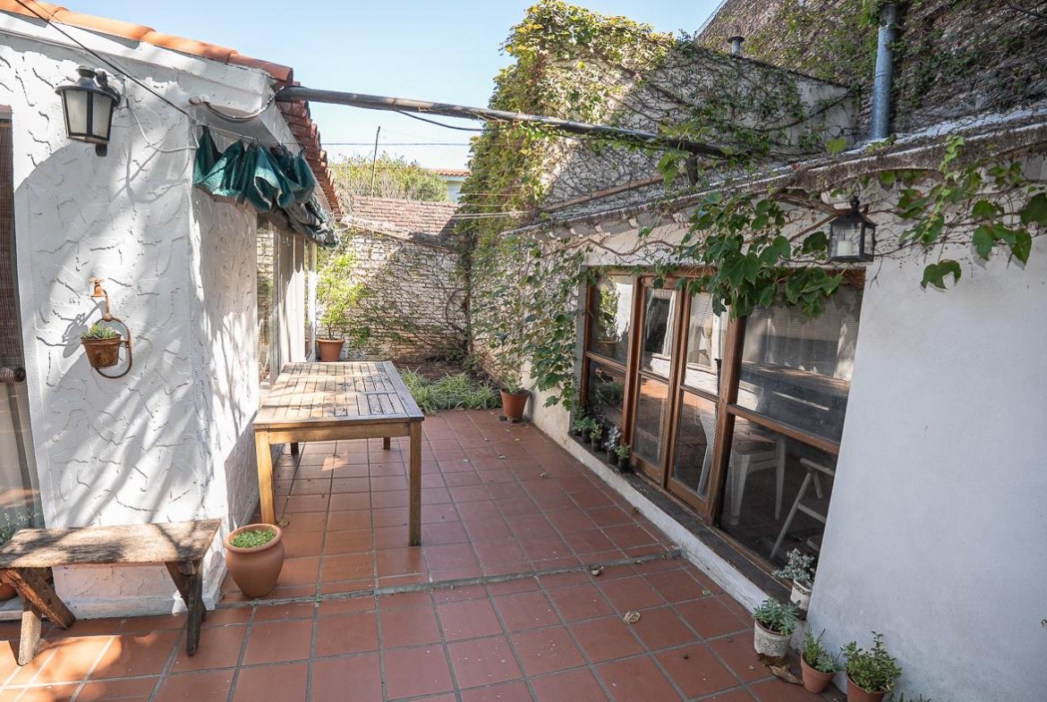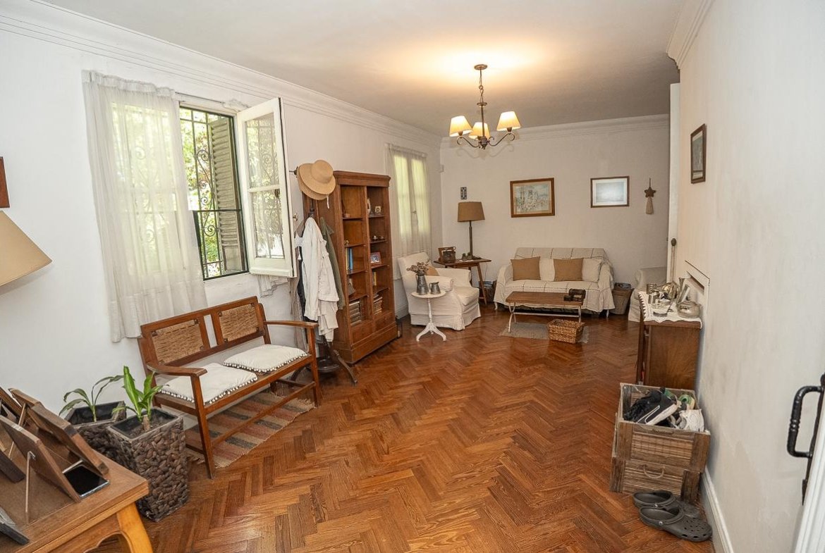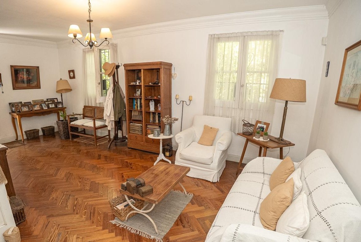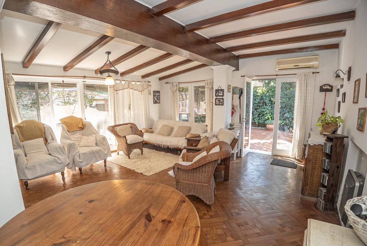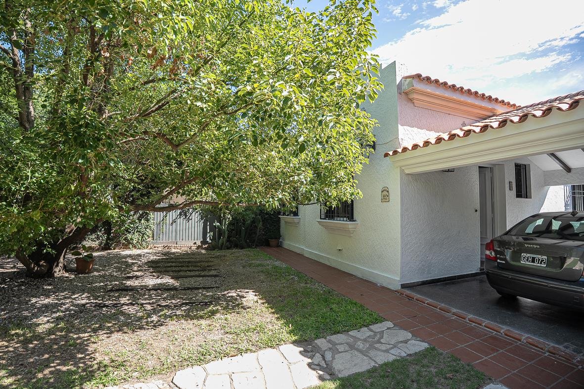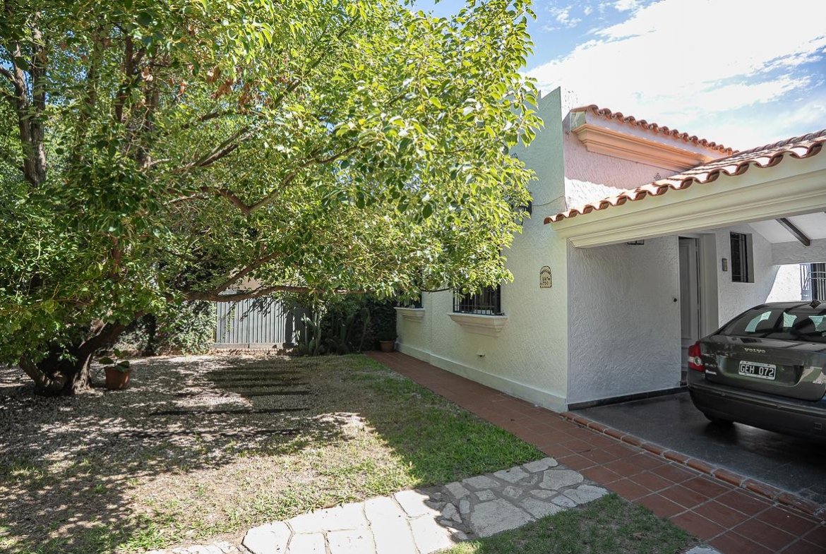 El ingreso se realiza a través de un jardín frontal, que aporta retiro y privacidad, dando paso al living principal y al comedor formal, ambos con cómodas dimensiones y buena iluminación natural. La propiedad cuenta con tres dormitorios bien distribuidos y un escritorio independiente, ideal para home office, estudio o espacio multifuncional. Dispone de cocina comedor funcional, con correcta circulación y conexión hacia un estar comedor adicional, generando distintos espacios para la vida diaria y reuniones sociales. Desde el sector lateral se accede a un patio con lavadero independiente, aportando practicidad al área de servicio. La vivienda incluye además un sótano, ideal para cava de vinos, guardado o espacio de apoyo. Desde el interior se accede al amplio jardín trasero, arbolado y con excelente privacidad, donde se encuentra un cuarto de guardado o quincho, espacio versátil para encuentros y usos recreativos. El jardín cuenta con parrillero, conformando un entorno ideal para disfrutar al aire libre. La propiedad posee calefacción central por caldera, brindando confort térmico en todos los ambientes.