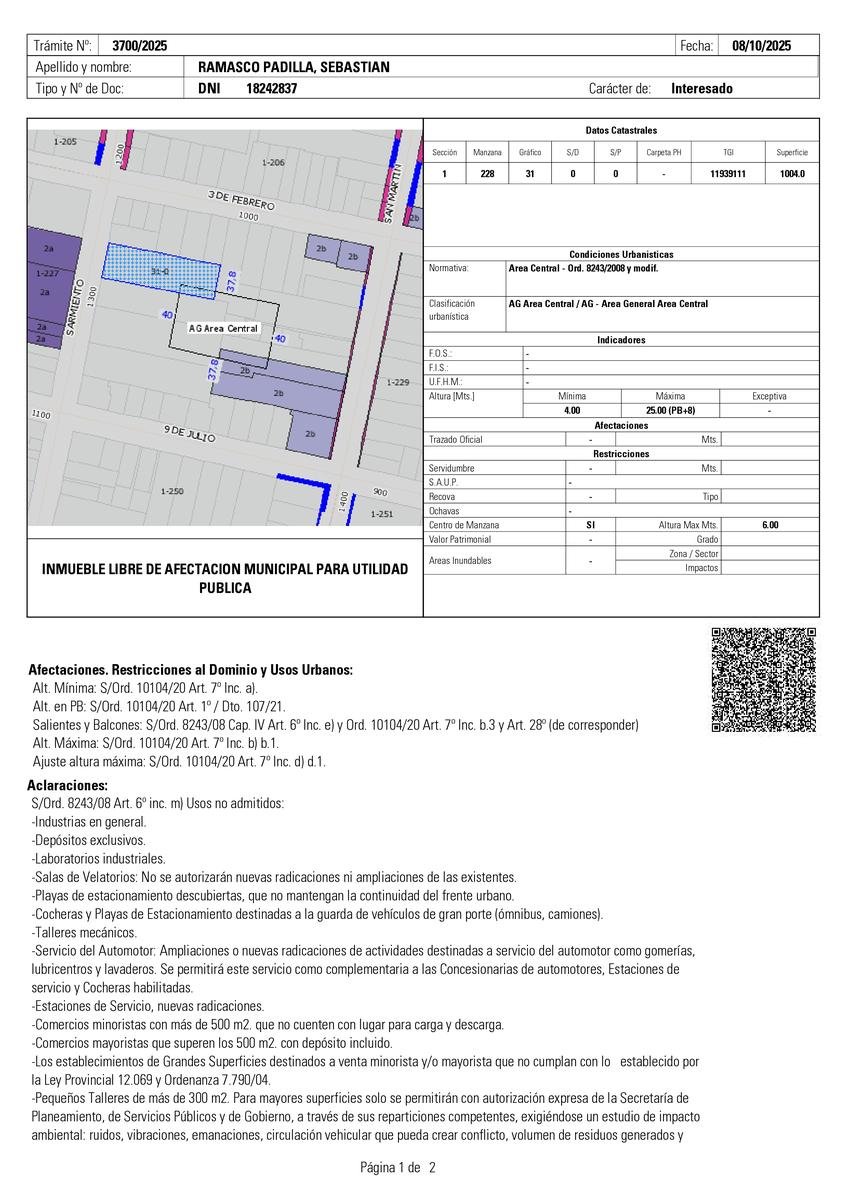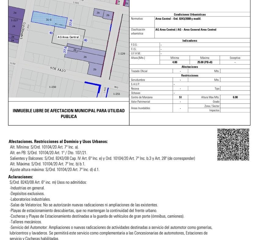 Actualmente, el terreno se encuentra edificado con una construcción destinada a cocheras desarrollada en dos niveles, que ocupa gran parte del lote. Su estructura combina materiales de sólida construcción, con columnas, losas y cerramientos típicos de uso vehicular.La cochera cuenta con planta baja y primer piso, comunicados entre sí mediante rampa interna de hormigón, permitiendo la circulación y el acceso de vehículos en ambos niveles. El sector presenta amplias dimensiones y adecuada ventilación, con portón de ingreso sobre calle Sarmiento. Por su ubicación estratégica en pleno centro de Rosario y las características constructivas del inmueble, se trata de una propiedad ideal para uso como estacionamiento, garaje comercial o emprendimiento con potencial de desarrollo edilicio, en una de las zonas más demandadas de la ciudad. Posibilidad de construir PB+8.