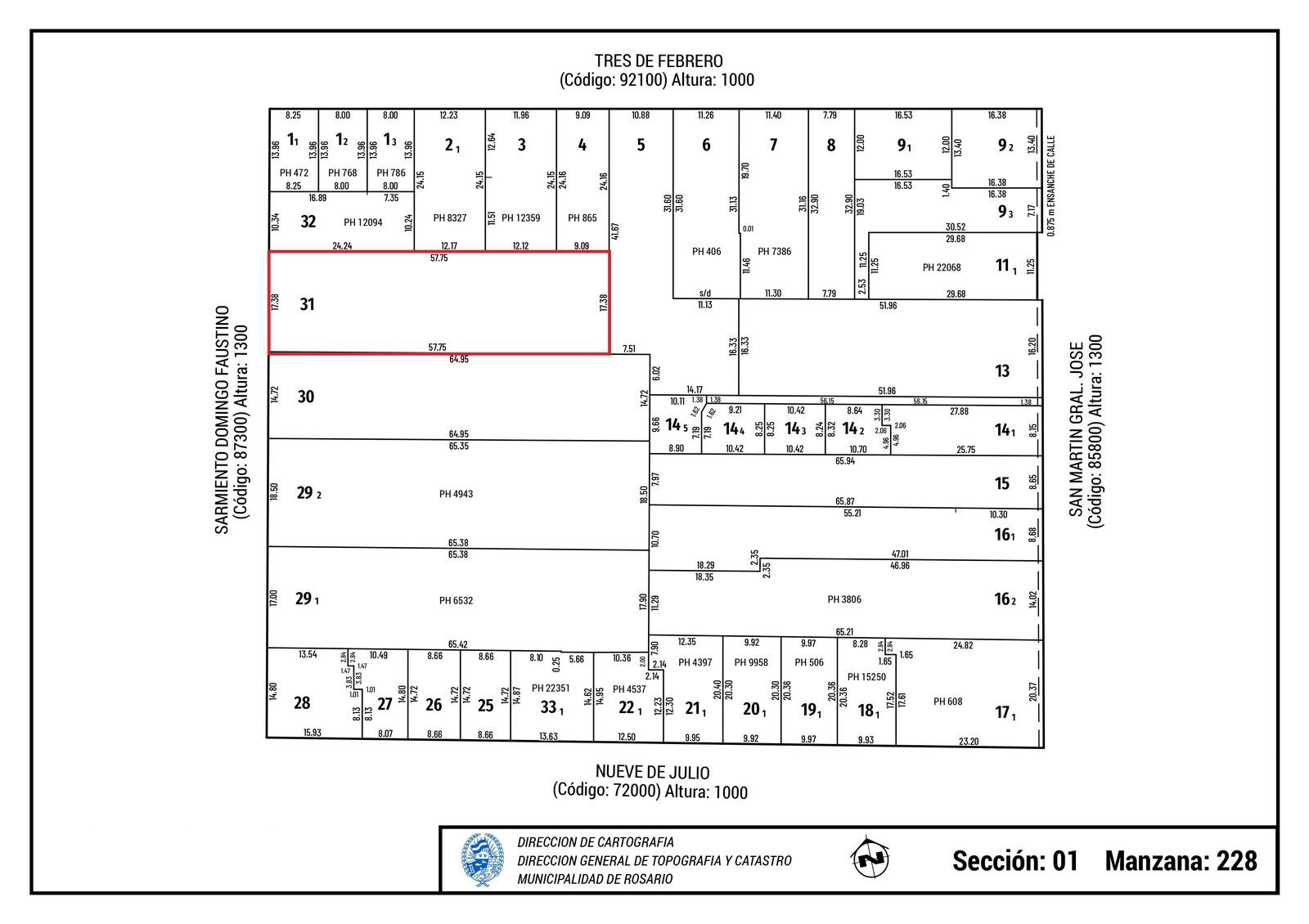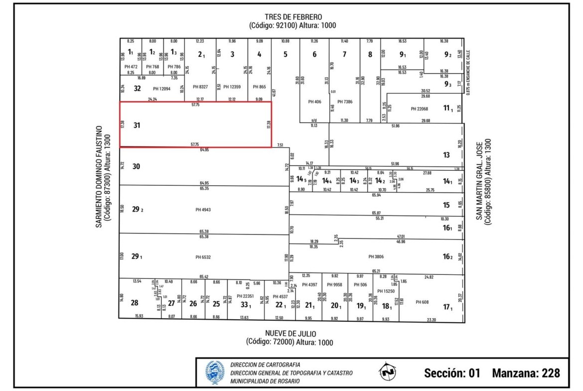 El inmueble se encuentra ubicado en la ciudad de Rosario, Provincia de Santa Fe, sobre calle Sarmiento 1331, entre 3 de Febrero y 9 de Julio. El terreno ya tiene hechase encuentra la bases hechas para el edificio, de 8 pisos. Se trata de un amplio lote de terreno con todo lo en él edificado, clavado y plantado, que conforme a la mensura confeccionada por el Ingeniero Civil Rodolfo Montesi Picot en septiembre de 1975 (registrada en el Departamento Topográfico de la Provincia bajo el Nº 86074/1976), presenta las siguientes medidas y colindancias: