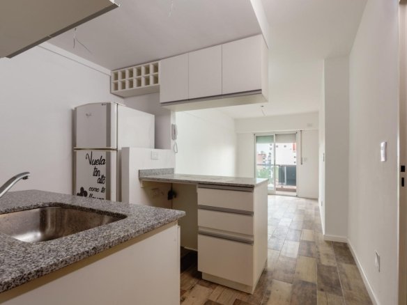 En planta alta, se accede a través de una escalera, que te lleva a un luminoso living comedor con cocina integrada. La cocina cuenta con bajo mesada y espacio técnico para artefacto de cocina y heladera. El living comedor ofrece espacio para un sillón y una mesa con cuatro sillas, con múltiples lugares de guardados. Un dormitorio con placard empotrado y un baño completo.