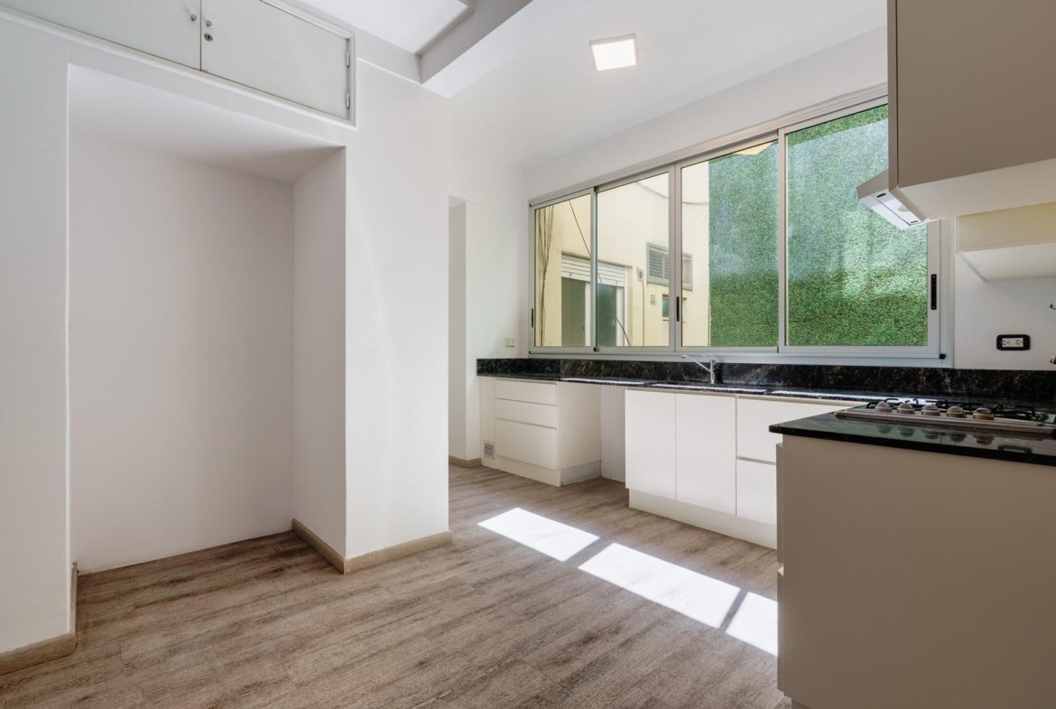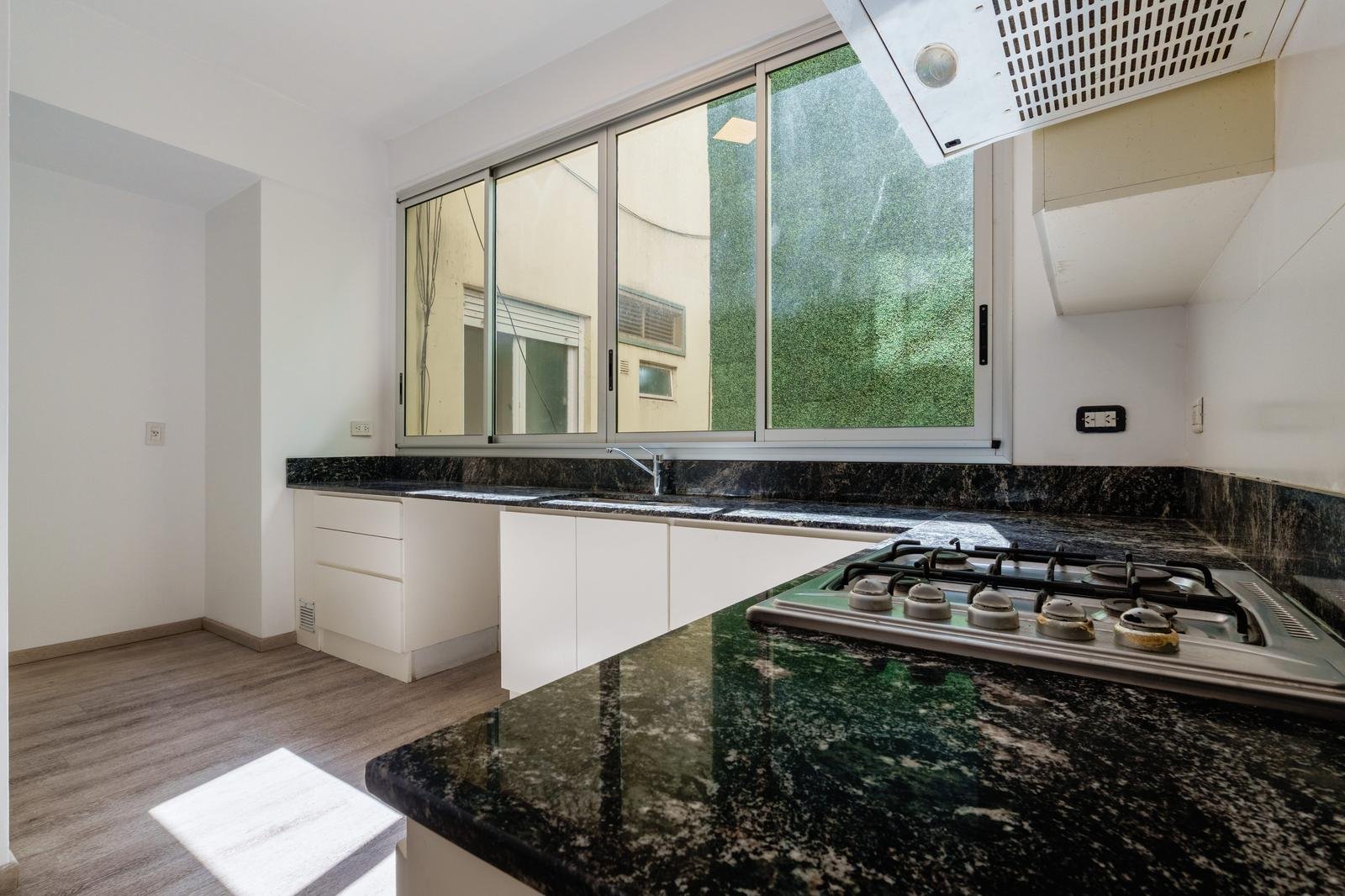 El departamento se desarrolla en un 1º piso al contrafrente. Se ingresa directamente a un hall con mueble de guardado que da paso a un gran living comedor con salida a un balcón. Otro ingreso lleva a una sala de estar o playroom, y otro paso comunica a un pasillo con espacio de guardado por el que se accede a dos amplios dormitorios con placares, a un baño completo, y a un tercer dormitorio con toilette privado. La cocina tiene un gran ventanal de iluminación y ventilación, gran mesada de granito, lugar previsto para lavavajillas, muebles bajo mesada, bacha y grifería de primera calidad. Tiene un gran espacio de comedor diario independiente. También tiene un lavadero independiente. El departamento es de gran categoría: sus pisos son de parquet de primera calidad, las paredes tienen terminación de yeso, la carpintería interior es excelente, y se encuentra totalmente reciclado, tanto la cocina como los baños. Edificio posee seguridad nocturna y los fines de semana. En planta baja tiene un patio de uso común. La adecuación de gas, tanto en el edificio como el departamento, es óptima. La calefacción es central.