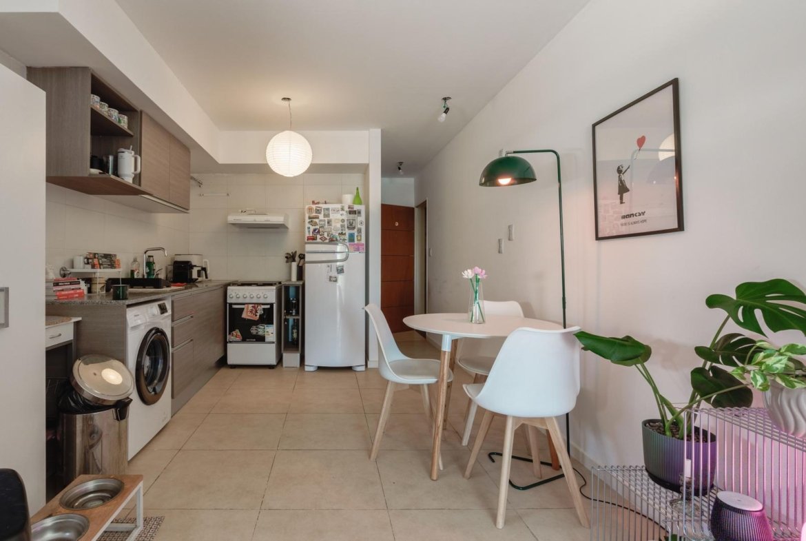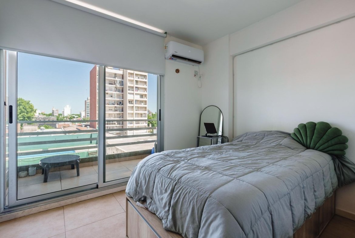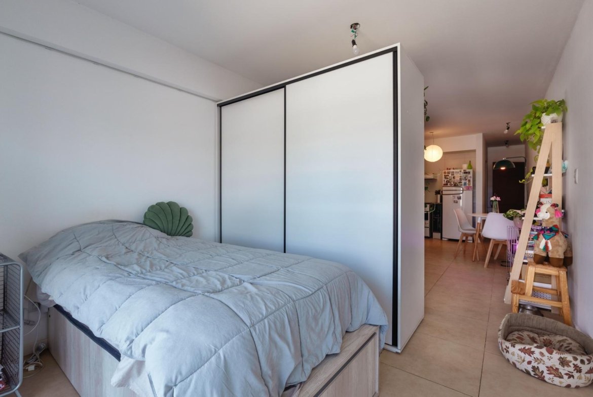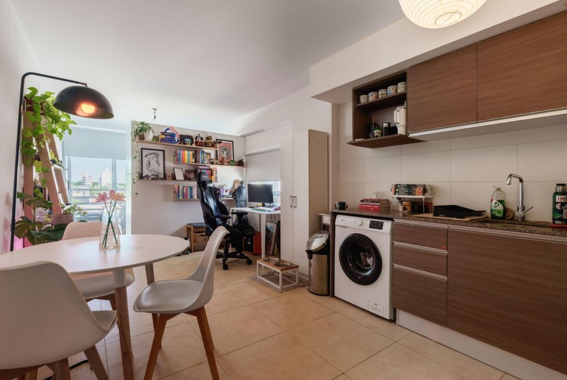 La unidad cuenta con un ambiente único cómodo y bien proporcionado, con cocina integrada equipada con alacenas de gran capacidad, lo que brinda un óptimo espacio de guardado, y baño completo de buenas dimensiones. El balcón corrido aporta ventilación natural, luz durante gran parte del día y un espacio ideal para disfrutar al aire libre en un entorno tranquilo. El edificio ofrece piscina, un diferencial muy valorado tanto para uso propio como para renta, y mantiene bajas expensas, lo que mejora notablemente la ecuación de inversión. Una opción ideal para renta permanente o temporaria, estudiantes, profesionales o inversores que buscan alta demanda y fácil comercialización.