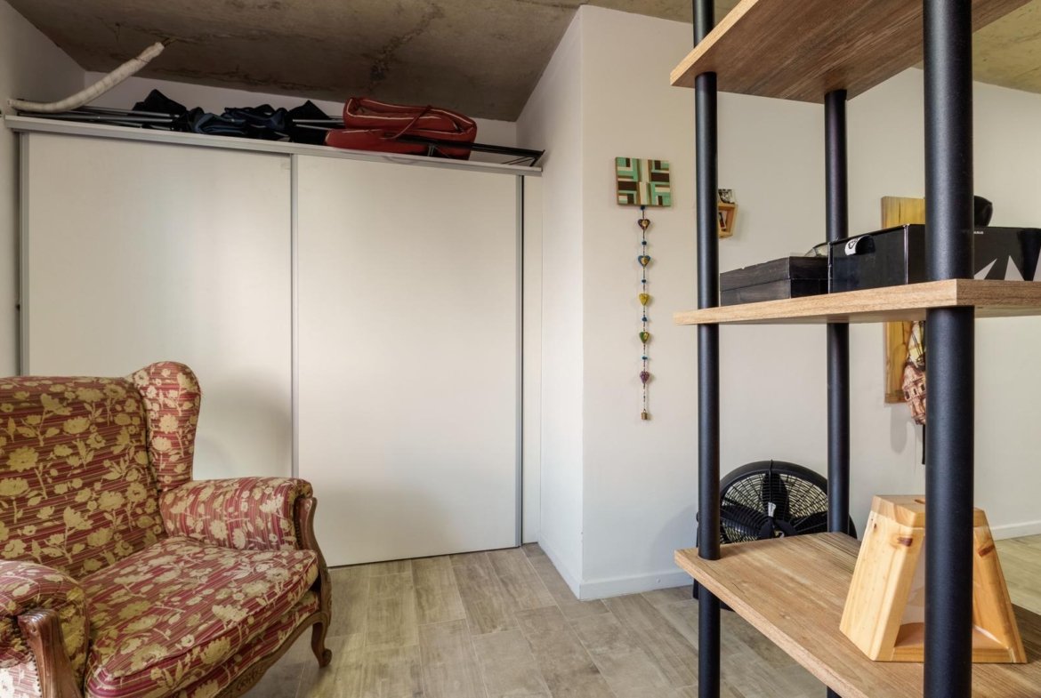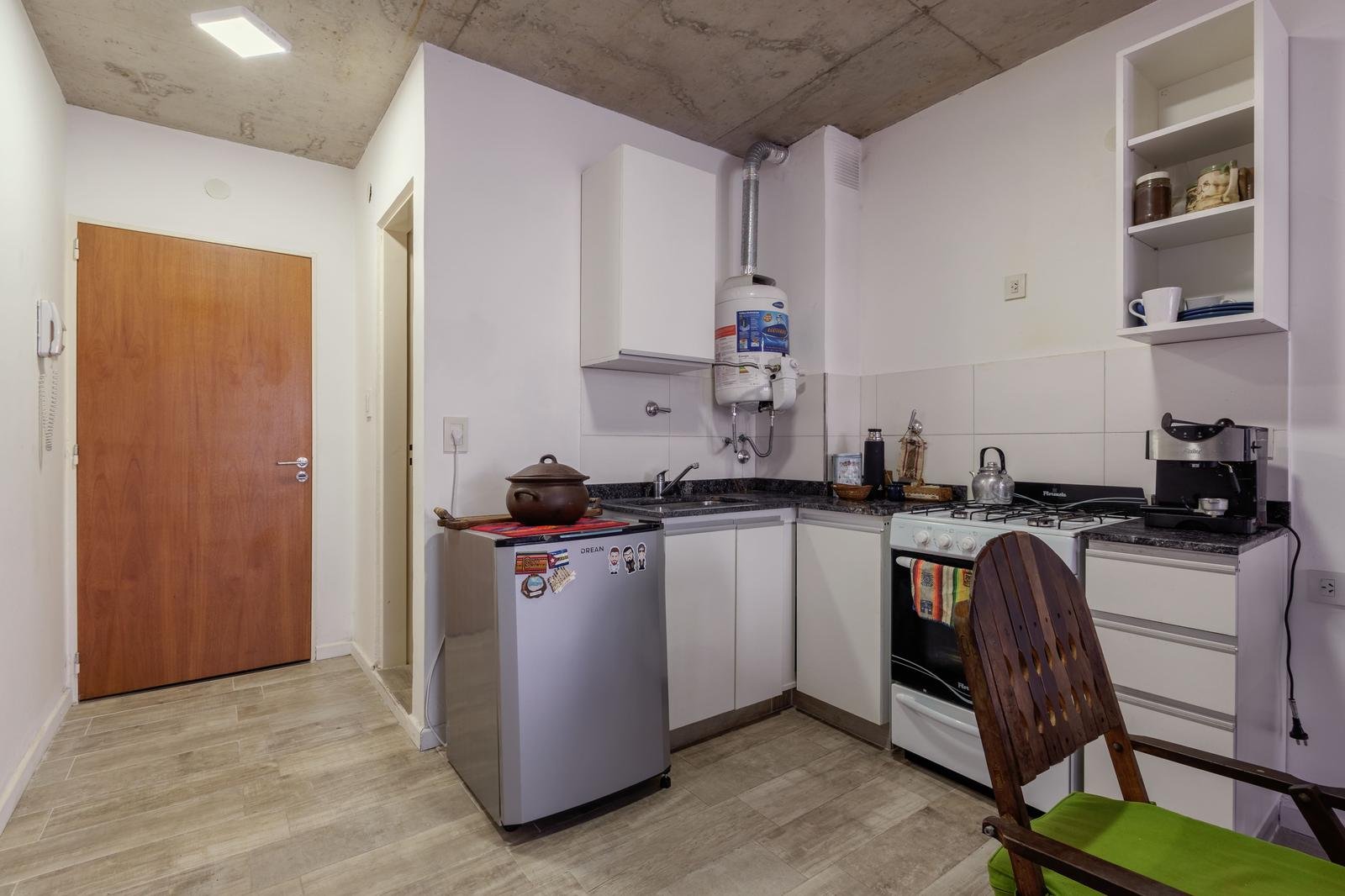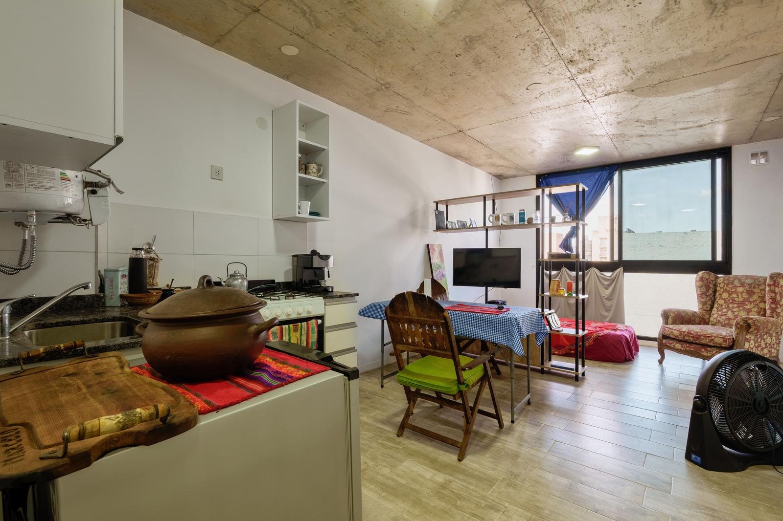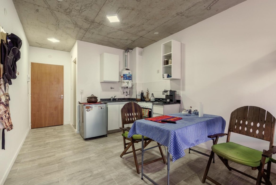 El ingreso es directo al ambiente principal, amplio y luminoso, que cuenta con un placard de guardado de dos puertas corredizas con interior completo, optimizando el espacio de almacenamiento. La unidad dispone de una barra desayunadora plegable, ideal para sumar funcionalidad sin perder amplitud, y un mueble divisorio con rack para televisor, que permite sectorizar el espacio de estar y descanso de manera práctica y estética. La cocina integrada se presenta totalmente equipada, con bajo mesada y alacena a estrenar, aportando diseño y comodidad para el uso diario. El baño es completo, con bañera y terminaciones modernas, manteniendo la coherencia con el resto del departamento.