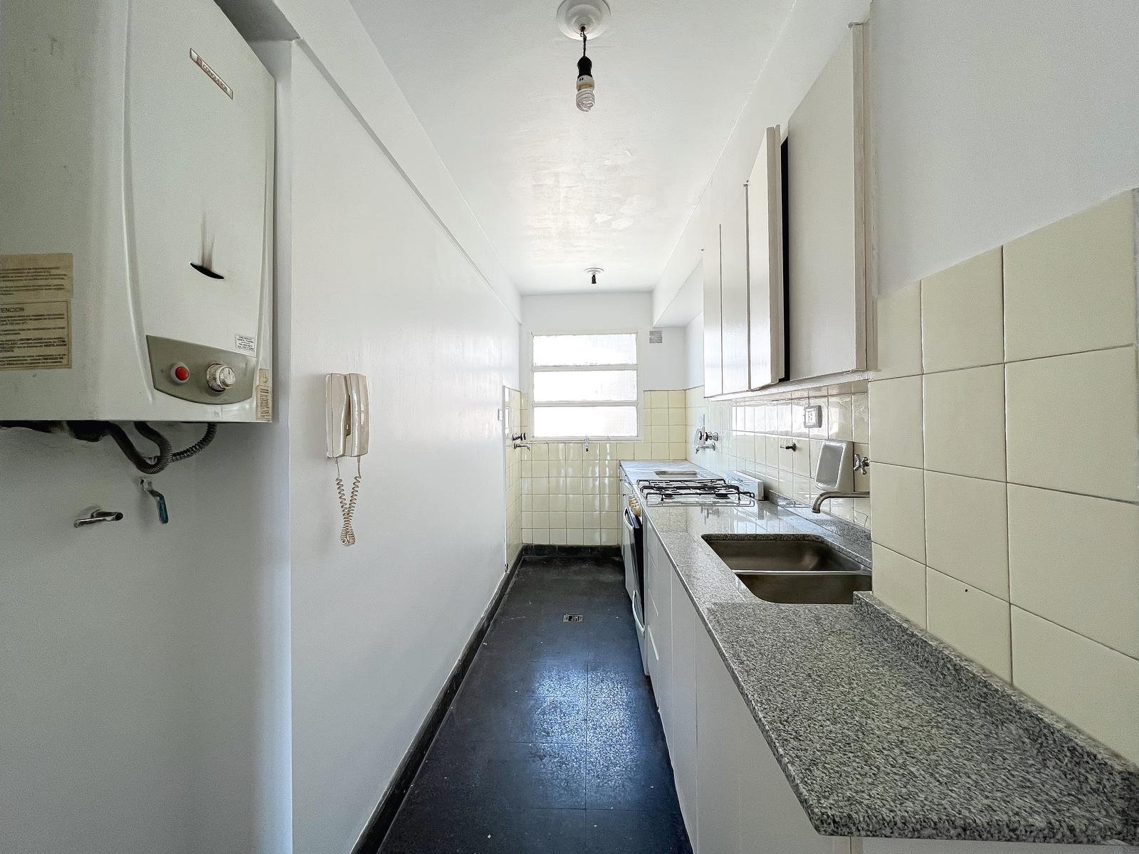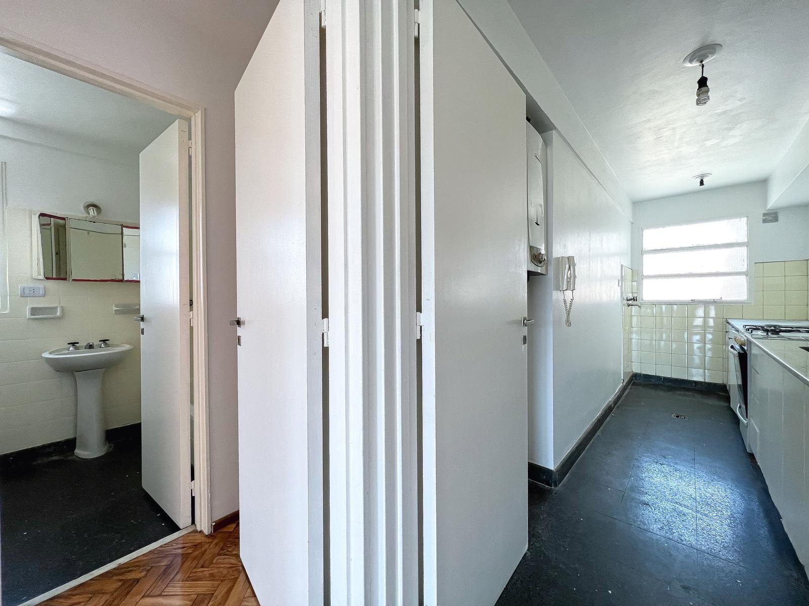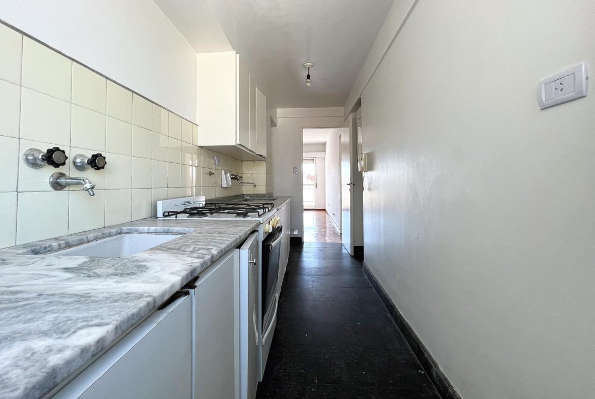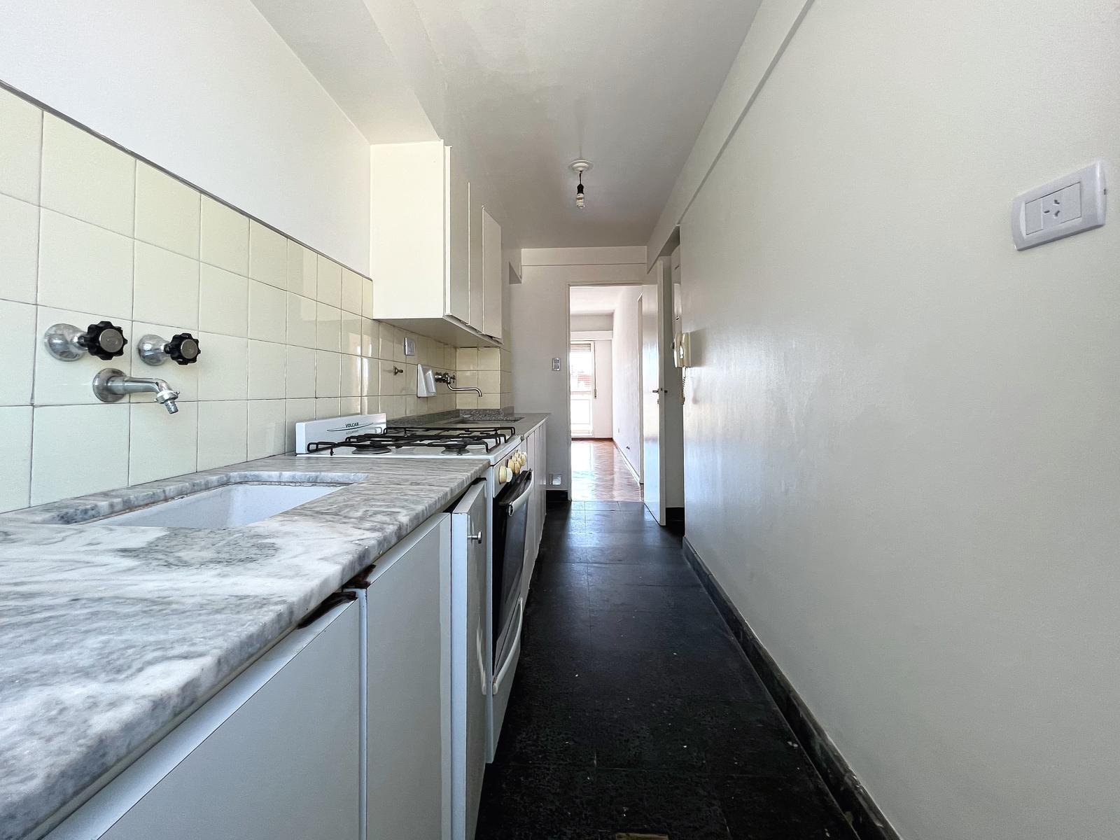 Ingreso al living comedor con balcón corrido. Cocina separada con lavadero sectorizado, muebles bajo mesada y alacenas de melamina, mesada de mármol, y bachas de acero inoxidable, todo en muy buen estado de uso. Dos amplios dormitorios con placares empotrados que brindan espacio de guardado. Baño completo con loza sanitaria, apliques y grifería acorde a su época en excelente estado, ventilación natural. Pisos de parquet plastificados en perfecto estado, combinados con granito en espacios húmedos.