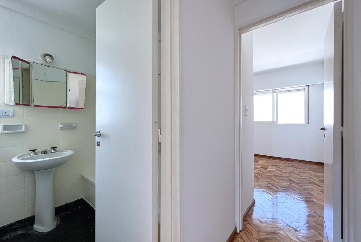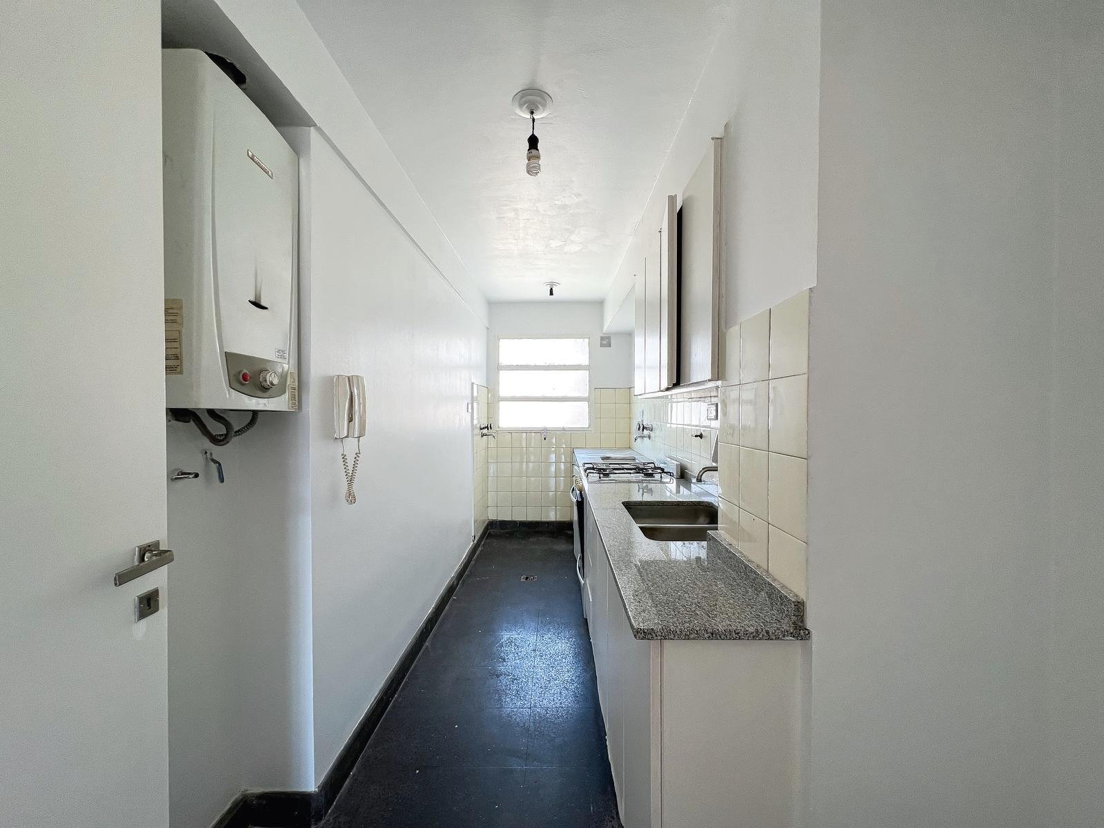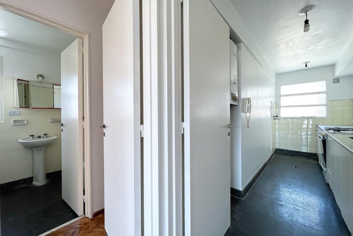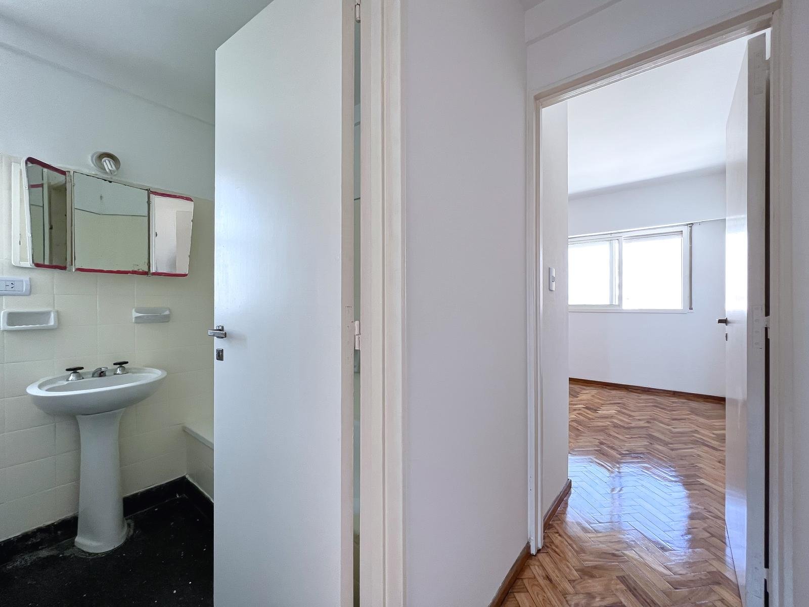 Ingreso al living comedor con balcón corrido. Cocina separada con lavadero sectorizado, muebles bajo mesada y alacenas de melamina, mesada de mármol, y bachas de acero inoxidable, todo en muy buen estado de uso. Dos amplios dormitorios con placares empotrados que brindan espacio de guardado. Baño completo con loza sanitaria, apliques y grifería acorde a su época en excelente estado, ventilación natural. Pisos de parquet plastificados en perfecto estado, combinados con granito en espacios húmedos.