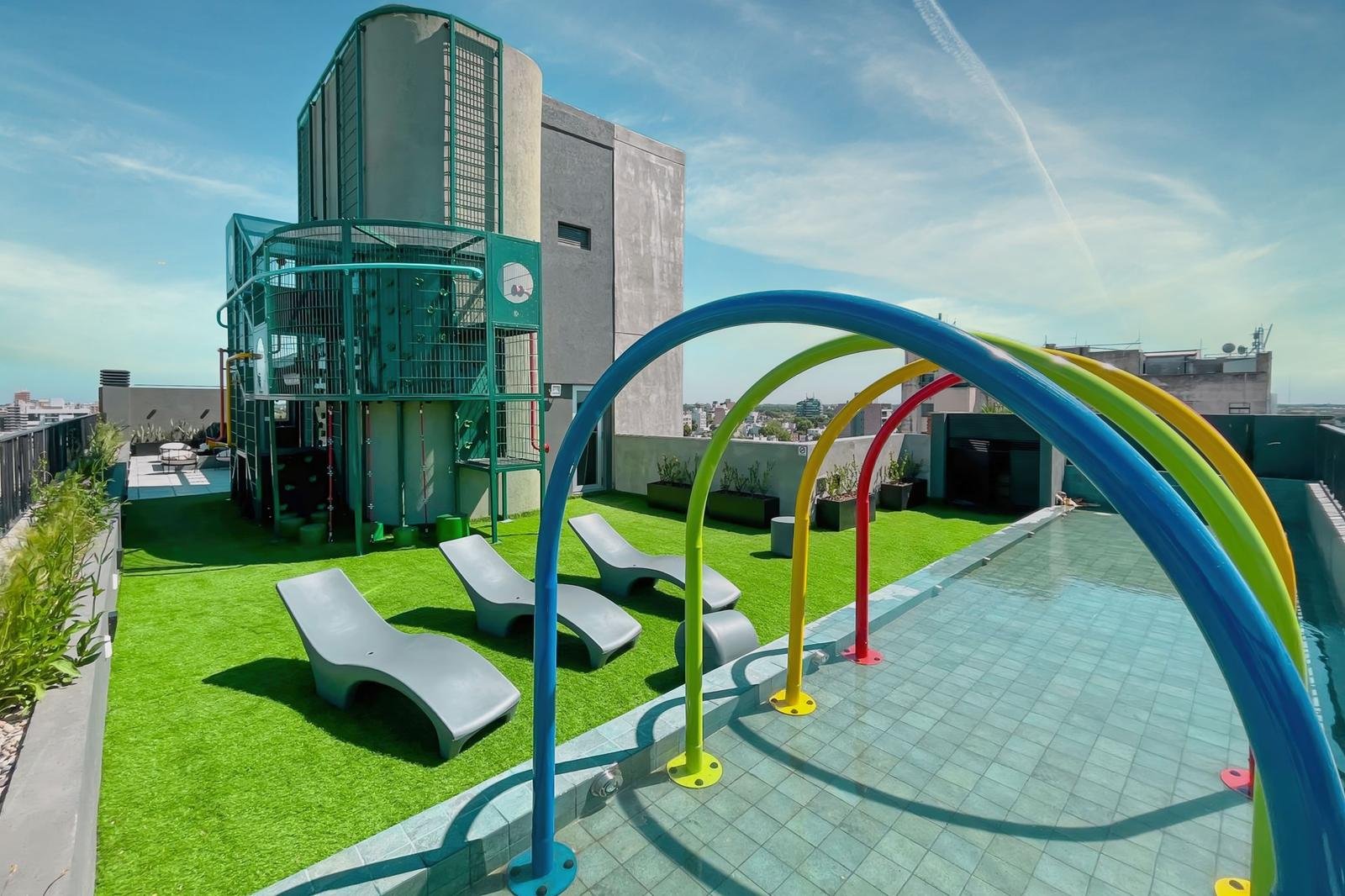 El edificio se desarrolla en subsuelo, planta baja y diez pisos, con terraza equipada. La terraza, de 200 m2, se compone de solárium, duchas, sector aeróbico, living fogonero y parrillero. Cerramientos de aluminio y vidrios DVH de alta prestación. Las puertas de ingreso de seguridad, y las interiores de madera en PVC. Los pisos y revestimientos de porcelanato 60 x 60 con zócalos en porcelanato. La cocina con alacenas y bajo mesadas de diseño moderno con zócalos de aluminio y mesadas de granito. Conexiones para la colocación de estufa y preinstalación para aire acondicionado. La provisión de agua caliente por calefón o termotanque, y las griferías y loza sanitaria de primera calidad. La unidad en venta es un departamento de un dormitorio externo frente con balcón.