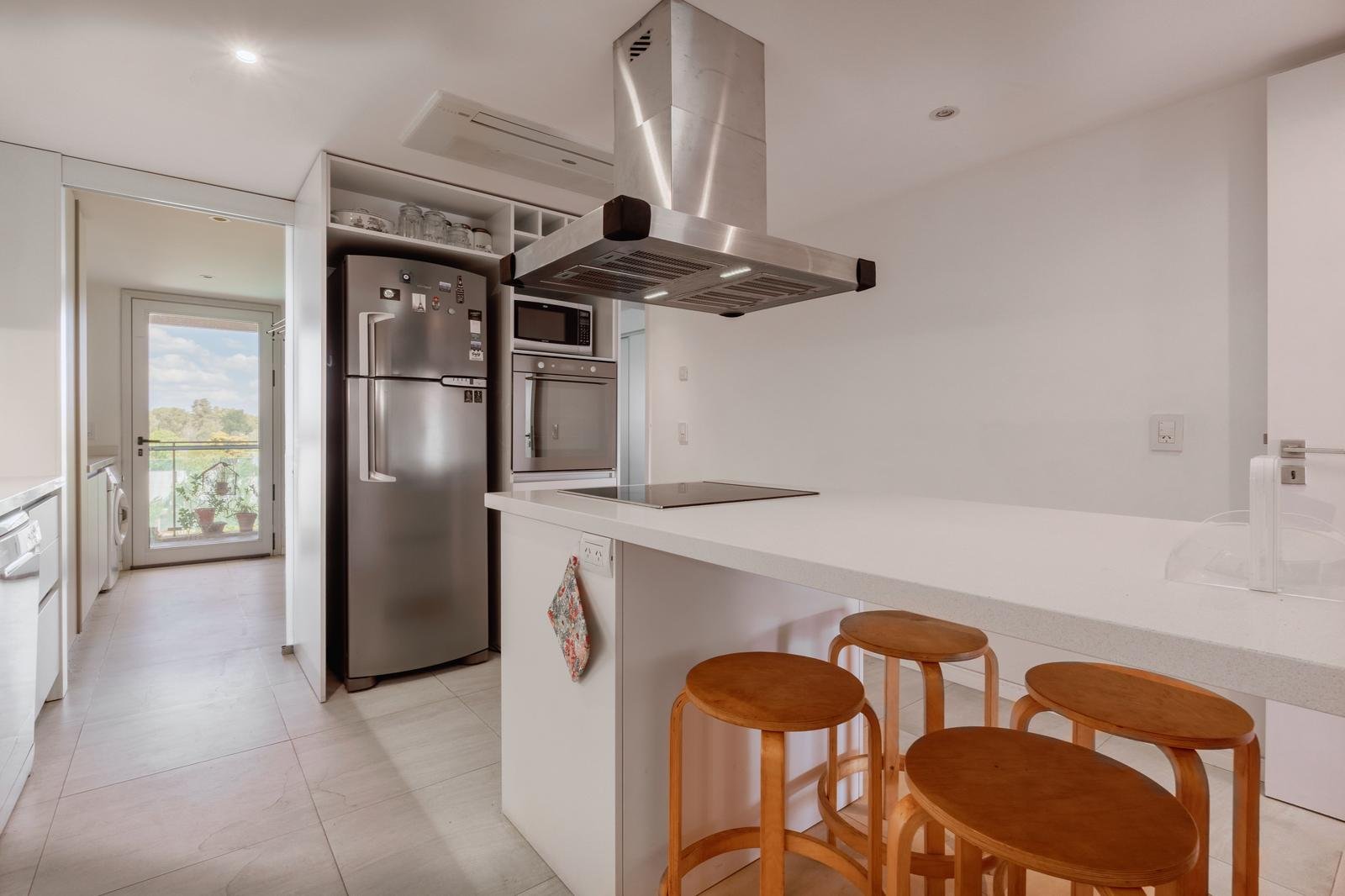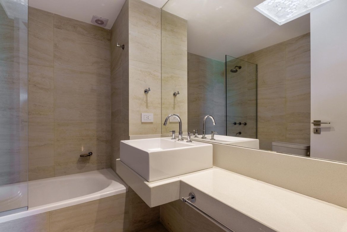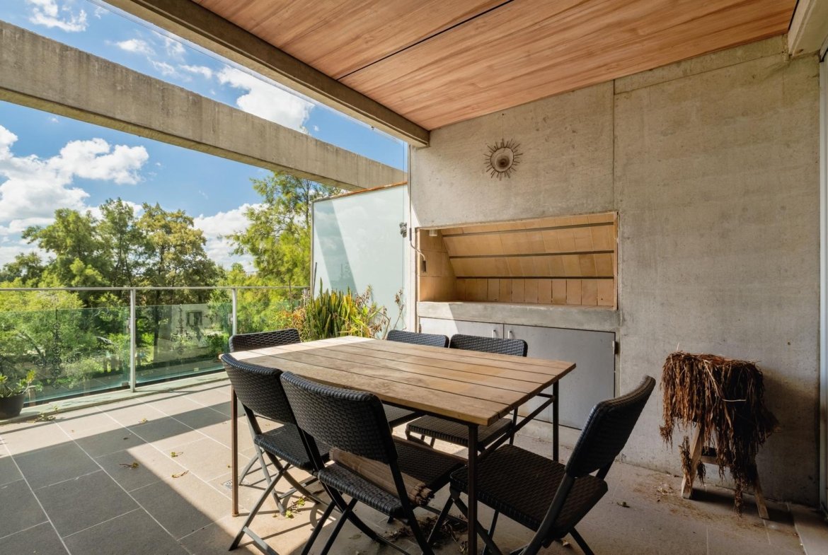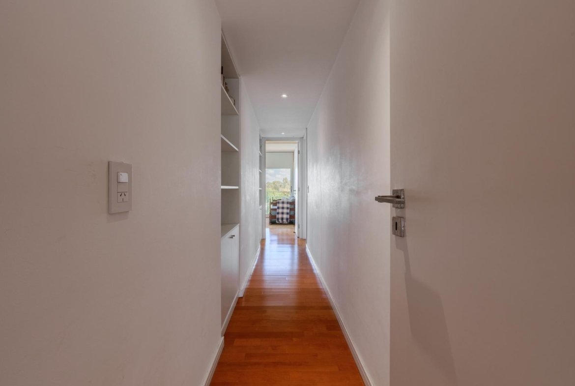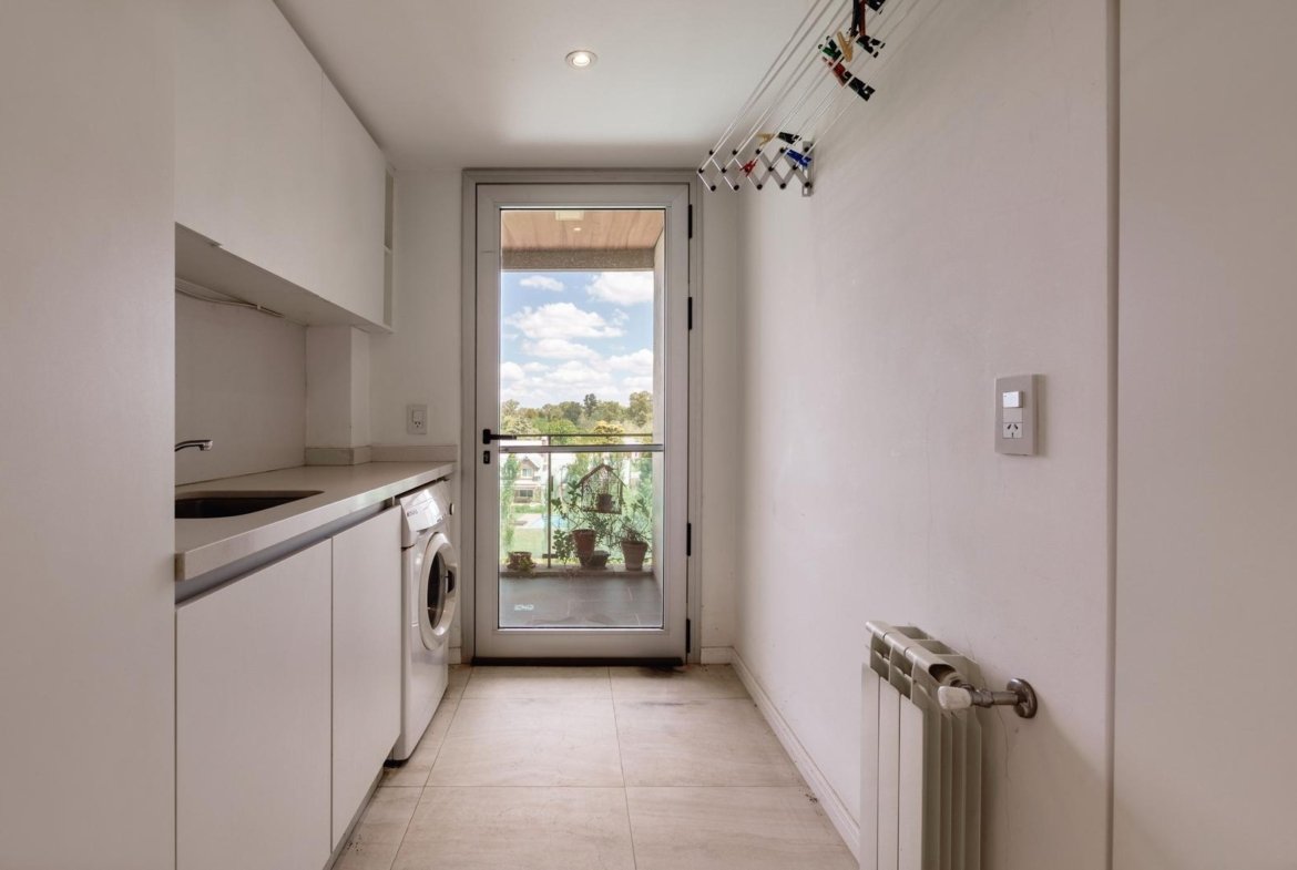 El ingreso conduce a un amplio estar–comedor, con un sutil desnivel hacia el estar diario que aporta jerarquía y diferenciación de ambientes. El sector social se destaca por su orientación norte, amplios ventanales de piso a techo y salida a un balcón aterrazado con parrillero, generando una expansión ideal para reuniones y disfrute al aire libre. La ventilación cruzada garantiza excelente circulación de aire y luminosidad natural en toda la unidad. La cocina–comedor semi integrada se encuentra separada virtualmente mediante puerta corrediza de vidrio repartido. Cuenta con isla central, mesada de Silestone blanco, mobiliario completo bajo mesada, bacha de acero inoxidable marca Johnson con grifería monocomando, anafe eléctrico de cuatro hornallas, horno empotrado independiente, campana extractora y espacios técnicos para lavavajillas, microondas y heladera. Desde allí se accede a un lavadero independiente con despensa y salida a un balcón cubierto destinado al tendido de ropa. La unidad dispone de tres dormitorios, todos con placares empotrados de piso a techo con interiores diseñados y puertas corredizas. El dormitorio principal cuenta con vestidor y baño en suite. En total, posee tres baños: toilette de recepción, baño completo con bañera y baño en suite con duchador, ambos con mamparas de vidrio, mesadas de Silestone, bachas de cerámica marca Ferrum, espejos y apliques colocados. Las terminaciones son de calidad premium: aberturas DVH de primera línea con mosquiteros y black out a medida, pisos de ingeniería símil madera en todos los ambientes principales y porcelanato en baños y lavadero. El departamento cuenta con calefacción por radiadores en todos los ambientes mediante caldera central, climatización con aires acondicionados empotrados en techo, y provisión de agua caliente central. El proyecto Aldea Dock Haus se compone de planta baja y cuatro pisos, distribuidos en cuatro módulos con ascensor independiente cada uno, totalizando 38 unidades de 1, 2 y 3 dormitorios, cocheras, bauleras y espacios comunes. Ofrece amenities de categoría: gimnasio equipado, spa, piscina con solárium, dos quinchos con parrillero, vestuarios, SUM, sala de juegos para niños y amplio jardín. El edificio cuenta con seguridad privada nocturna, alarma perimetral, control de accesos, portón automatizado y cámaras de seguridad.