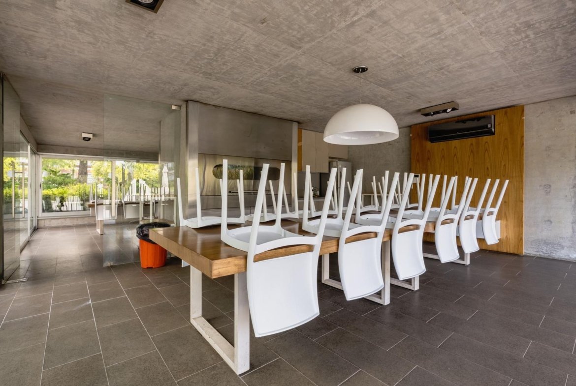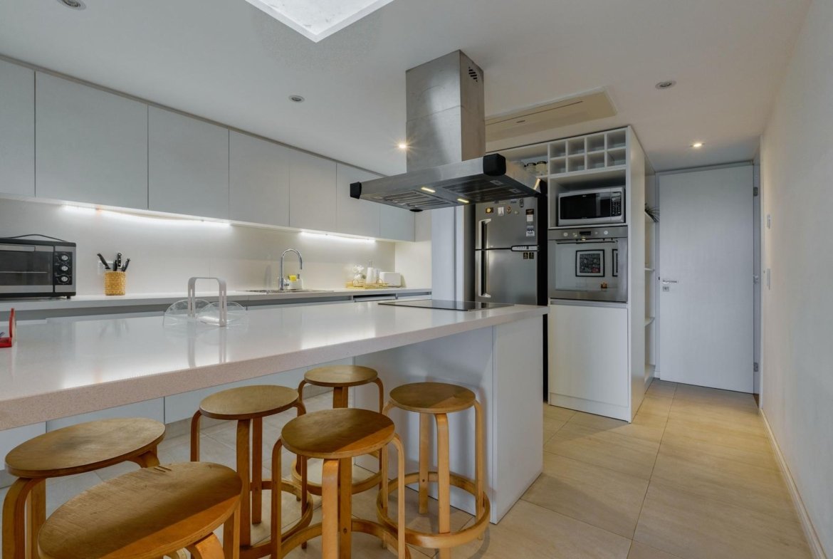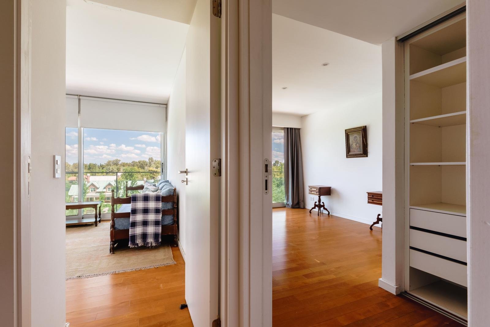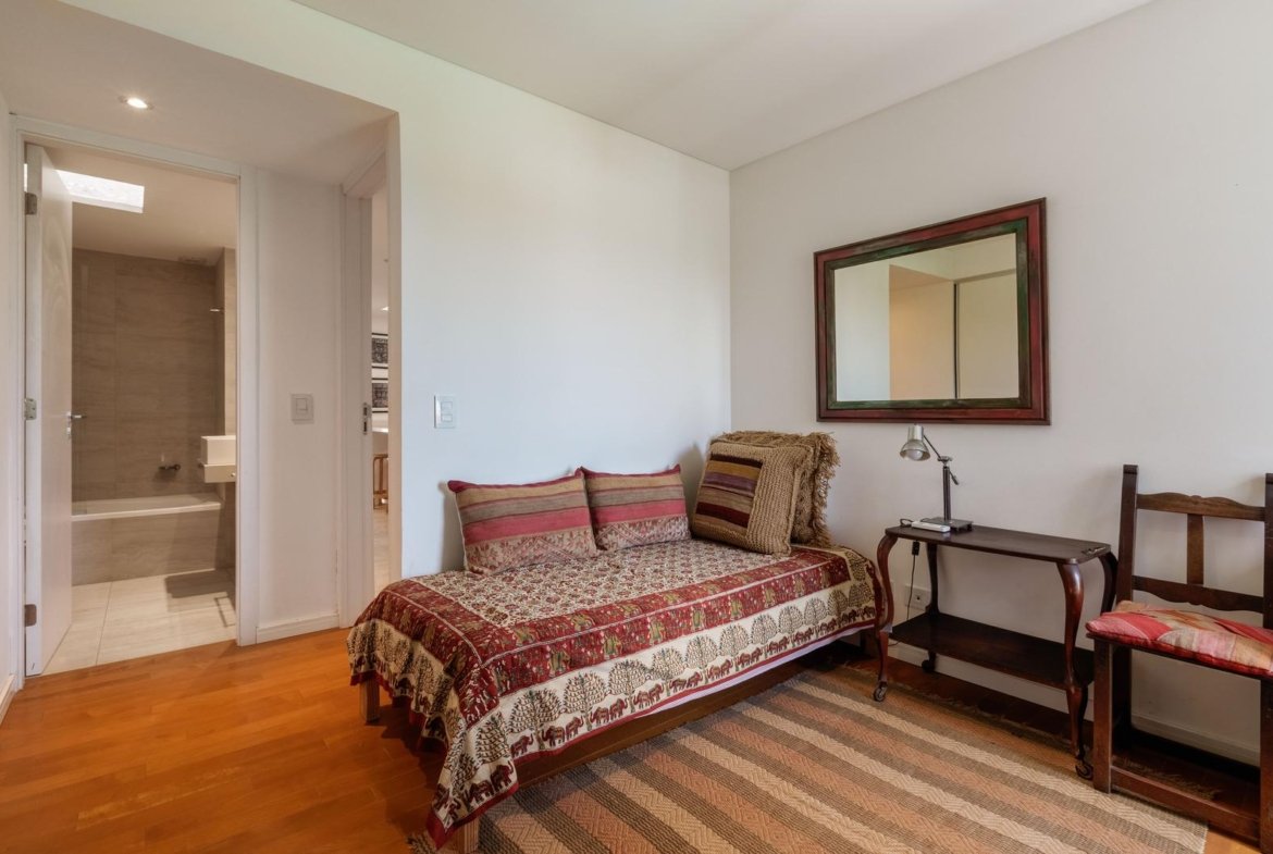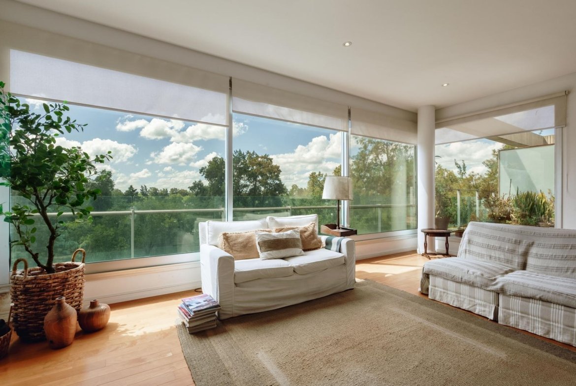 El ingreso conduce a un amplio estar–comedor, con un sutil desnivel hacia el estar diario que aporta jerarquía y diferenciación de ambientes. El sector social se destaca por su orientación norte, amplios ventanales de piso a techo y salida a un balcón aterrazado con parrillero, generando una expansión ideal para reuniones y disfrute al aire libre. La ventilación cruzada garantiza excelente circulación de aire y luminosidad natural en toda la unidad. La cocina–comedor semi integrada se encuentra separada virtualmente mediante puerta corrediza de vidrio repartido. Cuenta con isla central, mesada de Silestone blanco, mobiliario completo bajo mesada, bacha de acero inoxidable marca Johnson con grifería monocomando, anafe eléctrico de cuatro hornallas, horno empotrado independiente, campana extractora y espacios técnicos para lavavajillas, microondas y heladera. Desde allí se accede a un lavadero independiente con despensa y salida a un balcón cubierto destinado al tendido de ropa. La unidad dispone de tres dormitorios, todos con placares empotrados de piso a techo con interiores diseñados y puertas corredizas. El dormitorio principal cuenta con vestidor y baño en suite. En total, posee tres baños: toilette de recepción, baño completo con bañera y baño en suite con duchador, ambos con mamparas de vidrio, mesadas de Silestone, bachas de cerámica marca Ferrum, espejos y apliques colocados. Las terminaciones son de calidad premium: aberturas DVH de primera línea con mosquiteros y black out a medida, pisos de ingeniería símil madera en todos los ambientes principales y porcelanato en baños y lavadero. El departamento cuenta con calefacción por radiadores en todos los ambientes mediante caldera central, climatización con aires acondicionados empotrados en techo, y provisión de agua caliente central. El proyecto Aldea Dock Haus se compone de planta baja y cuatro pisos, distribuidos en cuatro módulos con ascensor independiente cada uno, totalizando 38 unidades de 1, 2 y 3 dormitorios, cocheras, bauleras y espacios comunes. Ofrece amenities de categoría: gimnasio equipado, spa, piscina con solárium, dos quinchos con parrillero, vestuarios, SUM, sala de juegos para niños y amplio jardín. El edificio cuenta con seguridad privada nocturna, alarma perimetral, control de accesos, portón automatizado y cámaras de seguridad.