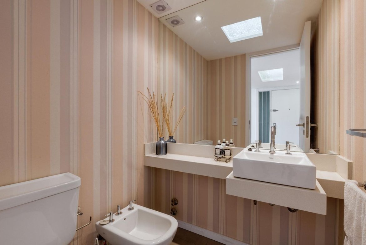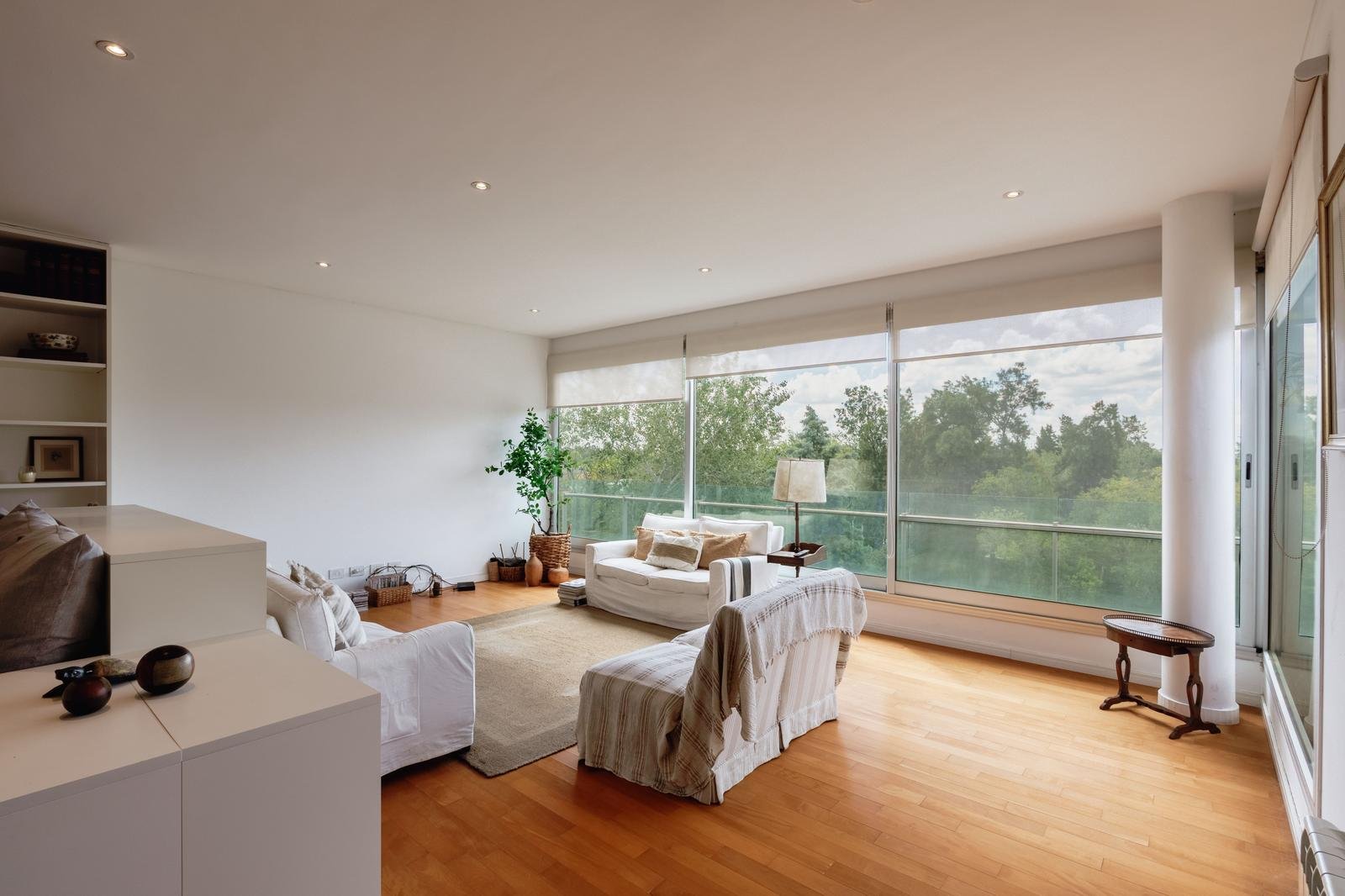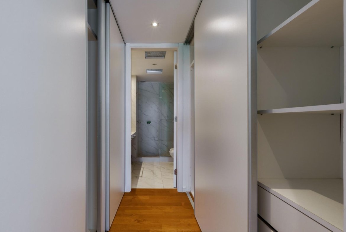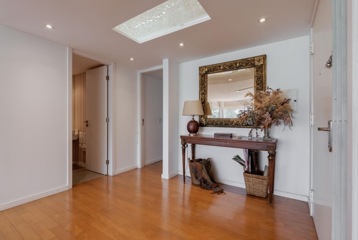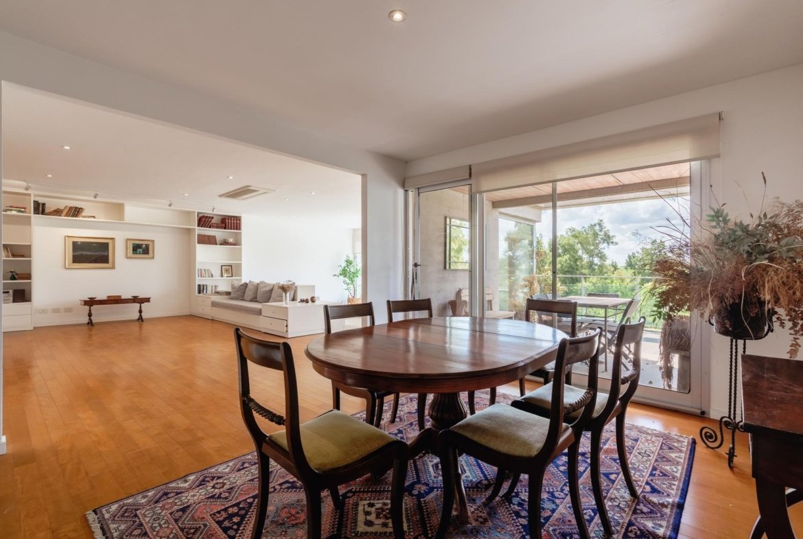 El ingreso conduce a un amplio estar–comedor, con un sutil desnivel hacia el estar diario que aporta jerarquía y diferenciación de ambientes. El sector social se destaca por su orientación norte, amplios ventanales de piso a techo y salida a un balcón aterrazado con parrillero, generando una expansión ideal para reuniones y disfrute al aire libre. La ventilación cruzada garantiza excelente circulación de aire y luminosidad natural en toda la unidad. La cocina–comedor semi integrada se encuentra separada virtualmente mediante puerta corrediza de vidrio repartido. Cuenta con isla central, mesada de Silestone blanco, mobiliario completo bajo mesada, bacha de acero inoxidable marca Johnson con grifería monocomando, anafe eléctrico de cuatro hornallas, horno empotrado independiente, campana extractora y espacios técnicos para lavavajillas, microondas y heladera. Desde allí se accede a un lavadero independiente con despensa y salida a un balcón cubierto destinado al tendido de ropa. La unidad dispone de tres dormitorios, todos con placares empotrados de piso a techo con interiores diseñados y puertas corredizas. El dormitorio principal cuenta con vestidor y baño en suite. En total, posee tres baños: toilette de recepción, baño completo con bañera y baño en suite con duchador, ambos con mamparas de vidrio, mesadas de Silestone, bachas de cerámica marca Ferrum, espejos y apliques colocados. Las terminaciones son de calidad premium: aberturas DVH de primera línea con mosquiteros y black out a medida, pisos de ingeniería símil madera en todos los ambientes principales y porcelanato en baños y lavadero. El departamento cuenta con calefacción por radiadores en todos los ambientes mediante caldera central, climatización con aires acondicionados empotrados en techo, y provisión de agua caliente central. El proyecto Aldea Dock Haus se compone de planta baja y cuatro pisos, distribuidos en cuatro módulos con ascensor independiente cada uno, totalizando 38 unidades de 1, 2 y 3 dormitorios, cocheras, bauleras y espacios comunes. Ofrece amenities de categoría: gimnasio equipado, spa, piscina con solárium, dos quinchos con parrillero, vestuarios, SUM, sala de juegos para niños y amplio jardín. El edificio cuenta con seguridad privada nocturna, alarma perimetral, control de accesos, portón automatizado y cámaras de seguridad.
